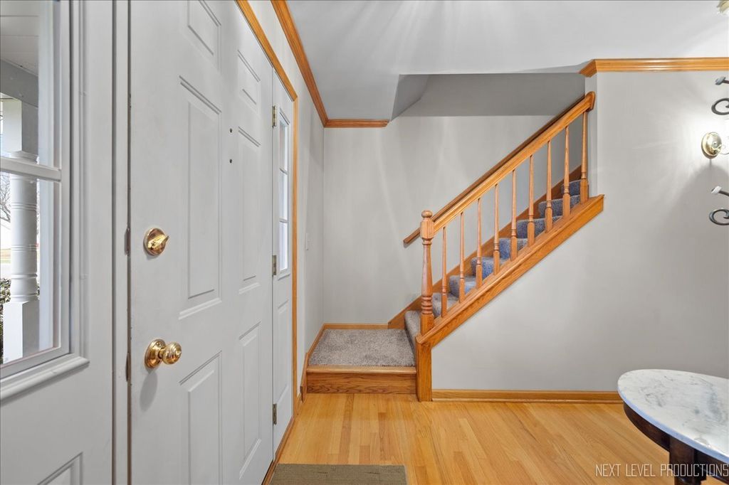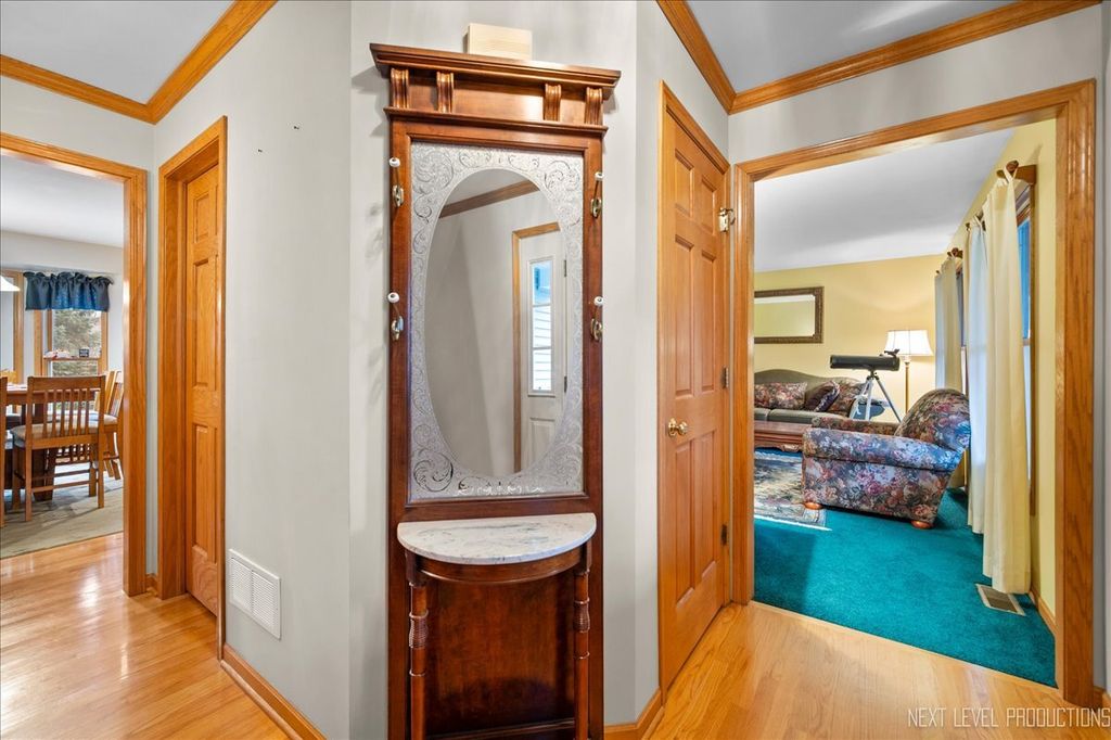 Come and sit a while on your wrap-around front porch and enjoy some downtime! This well cared for home has it all! Beautiful oak hardwood floors greet you at the door and flow back to the big eat-in kitchen with center island, granite c-tops, SS appliances, planning desk, and bayed eating space with door to the big patio overlooking a deep backyard! The formal living room has a wood cased opening that leads into the formal dining room with crown trimmed recessed ceiling and chair rail. The family room has a vaulted ceiling and floor to ceiling brick fireplace. For your convenience, there is a main floor laundry room with storage closet and garage access. The primary suite has a big walk-in closet and private bath with volume ceiling, dual sink vanity, big whirlpool tub, and shower. There are 3 more big bedrooms and a full hall bath. The large unfinished basement offers abundant storage space and has rough-in plumbing for a future bath. Two car attached garage plus extra storage. The prime location has a park across the street and all the conveniences you expect are minutes away! What more could you want?