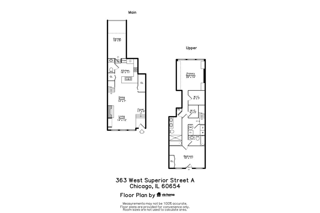 Modern two-story townhome in the heart of River North featuring a private gated entry from the sidewalk and attached one-car garage. This updated residence offers approximately 1,850 square feet of refined living space with the comfort and privacy of a single-family home. The main level features an open-concept layout with hardwood floors, a gas fireplace, and a newly remodeled kitchen with quartz countertops, custom cabinetry, a waterfall island, and professional-grade Thermador and Gaggenau appliances. Upstairs, the primary suite includes two walk-in closets and a spa-style bath with dual vanity, soaking tub, and separate shower. The second bedroom offers a Juliet balcony and custom plantation shutters. Additional highlights include a convenient second-floor laundry room, new wool carpet, and an unbeatable River North location steps to dining, shopping, galleries, and the Brown and Purple Line L station.