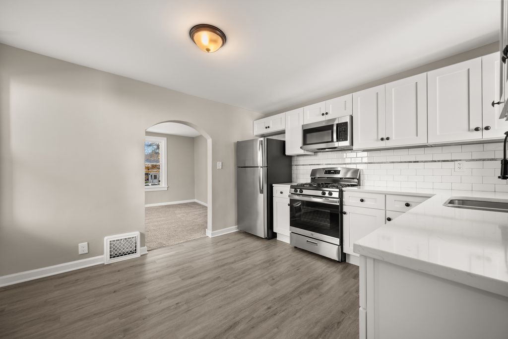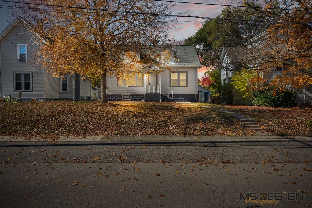 "This FULLY RENOVATED Cape Cod haven is a testament to meticulous design, blending classic architectural details with sophisticated, high-end finishes!" A covered front porch and black carriage-style light welcome you into 1,694 square feet of inspired, comfortable living! The sun-filled Living Room displays a large viewing window. Soft gray wall color, complementing carpeting and wide plank vinyl flooring, eye-catching light fixtures, white trim and doors, and arched openings are showcased in the heart of this lovely home. An arched opening leads you into the Dining Room, offering additional eating space. Dreamy white quartz countertops, white subway tile backsplash, and soft white cabinetry will amaze you! Our newly designed kitchen boasts soft-close and dovetail drawers, stainless steel GE appliances, a double sink with a black high arched cook's delight flex faucet. The first level newly remodeled bath features a gray vanity, circular mirror with black mounting brackets, and oil bronze fixtures. Seamless white subway tile and glass block window with an opening adorn the bath/shower combination, offering a crisp, clean aesthetic. There is a main-level bedroom nearby. Upstairs, discover two generous bedrooms and a versatile flex room, ideal for a home office, with charming dormer windows. An exceptional upgrade, the finished basement offers a family room, a laundry alcove, and a stunning full bathroom! Abundant recessed lighting, an exposed black ceiling, and a glass block window lend a distinctly cozy and modern vibe. Custom shower presents white subway tile surround and sliding glass door system. White undermount sink, furniture-look gray vanity with a pull-out organizational drawer, attractive black mirror, and an industrial-look black light bar complete this gorgeous lower-level bath space. The deep backyard lot offers a nice sidewalk to the one-car garage with a bonus 9' x 8' shop area and a second overhead garage door! A concrete-poured two-car-wide driveway expands to a poured apron to park a third car or your recreation vehicle, all with alley access. Move-in ready and worry-free! Major brand-new updates, including an architectural shingled roof, energy-efficient windows, a state-of-the-art HVAC system, and a water heater, ensure peace of mind for years to come. "Embrace this LIKE-NEW 100% RENOVATED HOME and the wonderful Sycamore community around you!"