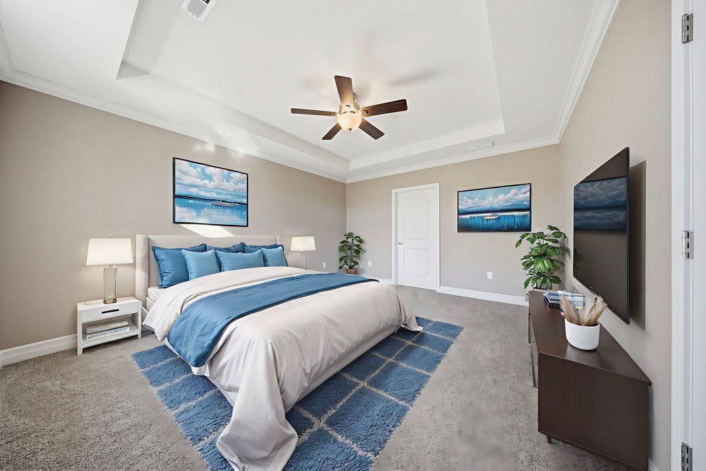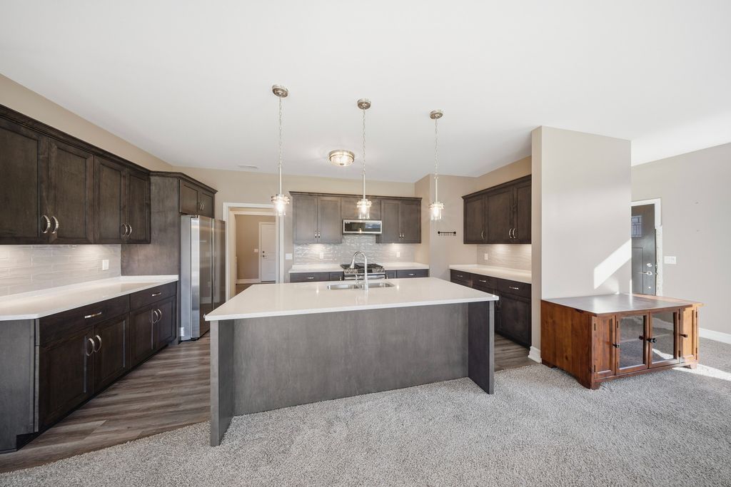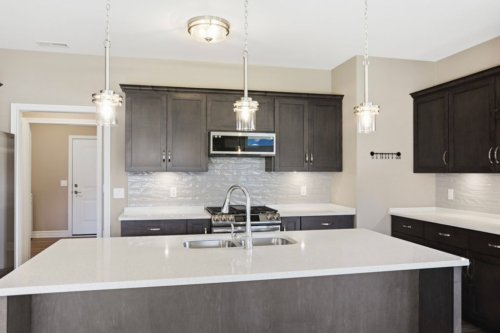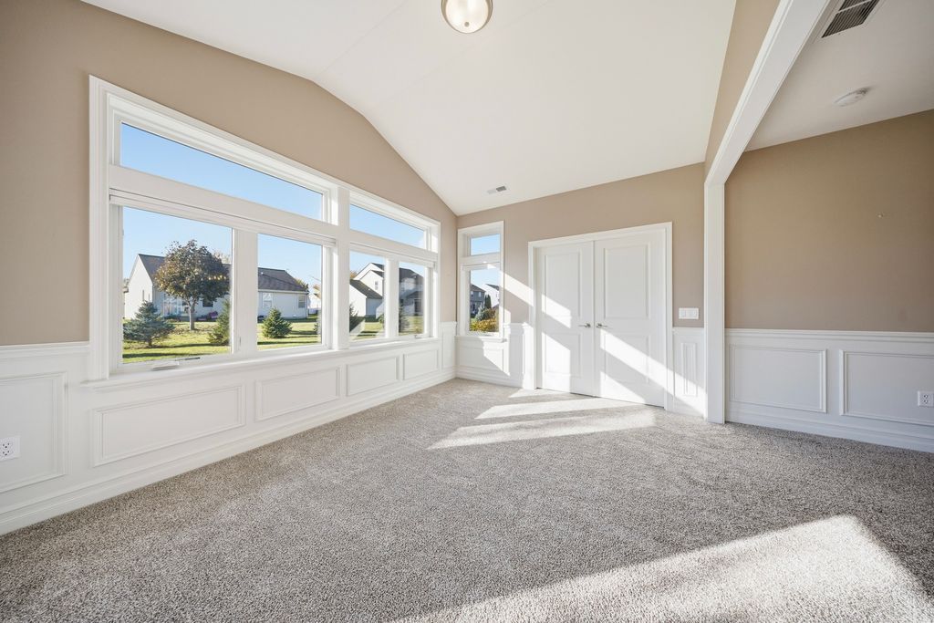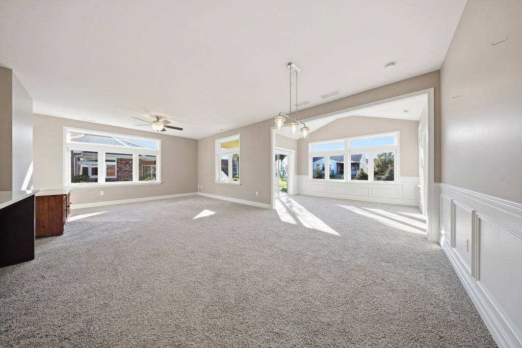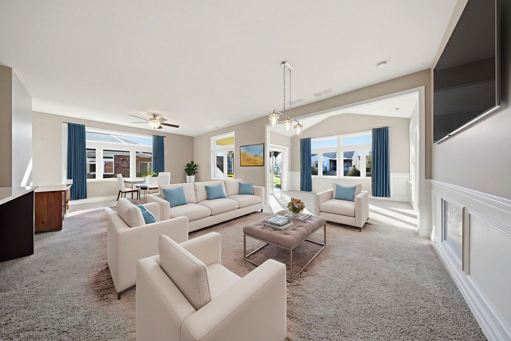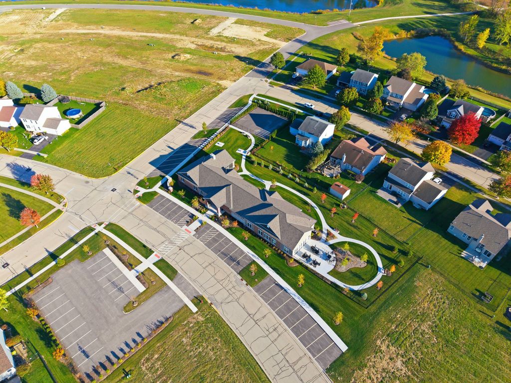 Here is your opportunity to own a condo in the Riverbend 55+ Community in Genoa. This 2 bedroom, 2 full bath, over 1800 sq. ft., ranch condo has a sunroom, a covered patio, and 3-car garage. Brand new clubhouse with a game room, kitchen, meeting area with fireplace, indoor pickle ball court and exercise room. You will find true old world craftsmanship showcased with modern farmhouse style custom details such as chair-rail high wainscoting in dining area and sunroom and oversized solid wood trim, windowsills, & crown molding throughout. Open floor plan with 9-foot ceilings and a vaulted sunroom ceiling. Open kitchen featuring quality, high-end Brakur Custom Cabinetry with under-cabinet lighting, quartz countertops and a large island where there can be seating for 4 to gather around. There are Pocket doors between mud room/hall and bedroom. French doors leading to the office. The primary bedroom suite has a stunning tray ceiling with crown and additional picture frame molding; large main bath has double sinks, ceramic flooring, 9' 6" x 4', no-step, ceramic shower with teak bench; linen closet, and huge, 10' x 8', walk-in closet. A covered patio to enjoy peaceful nights and views. Immediate occupancy.
