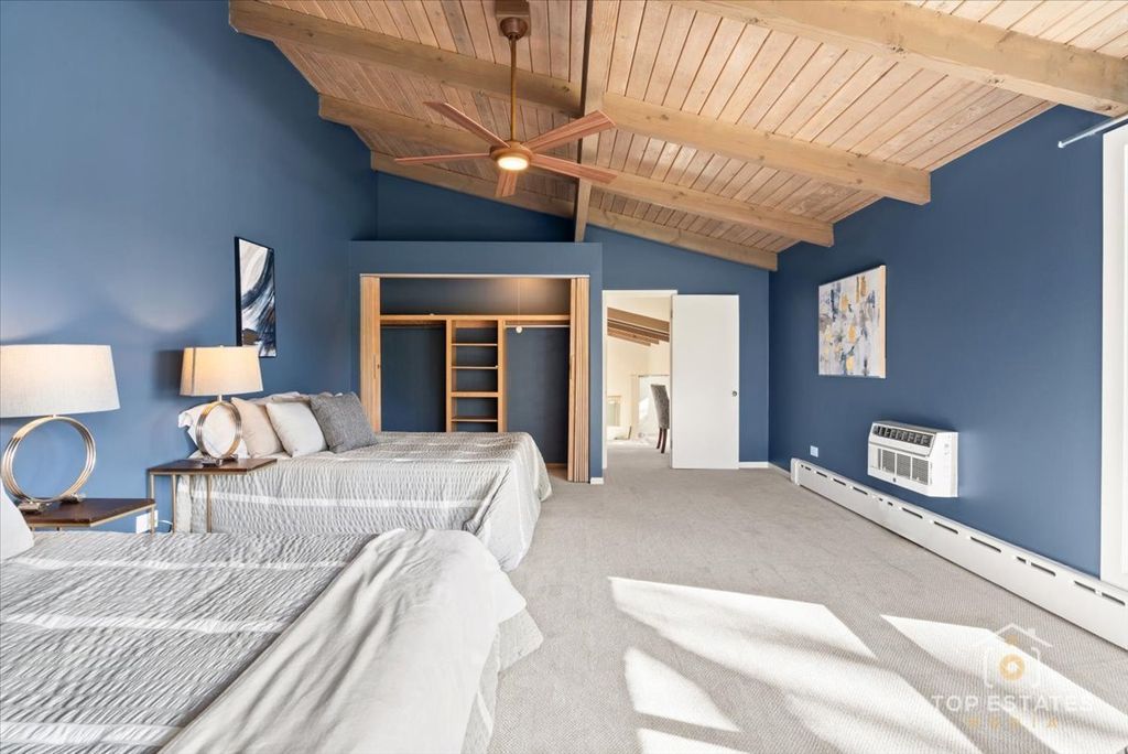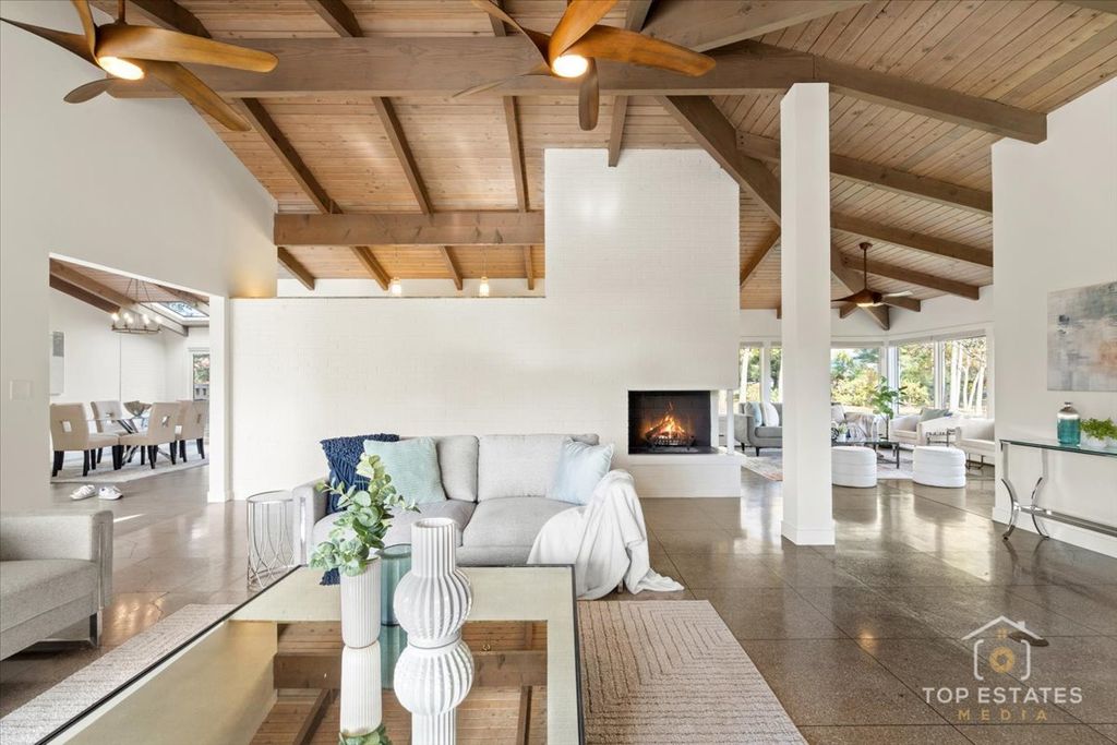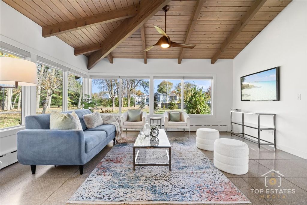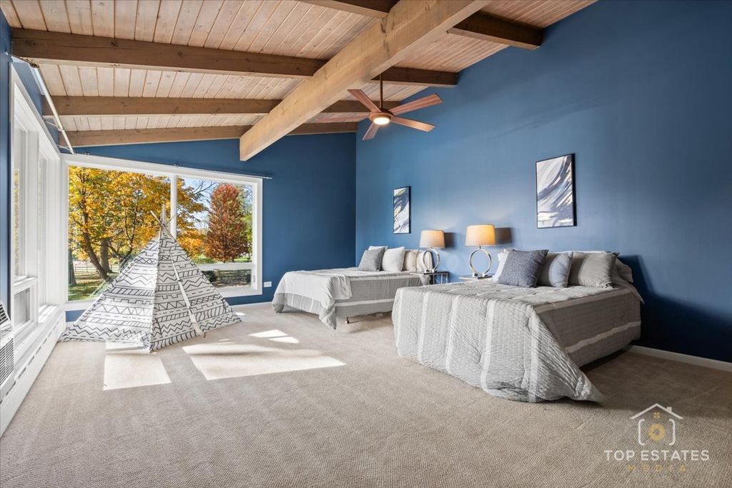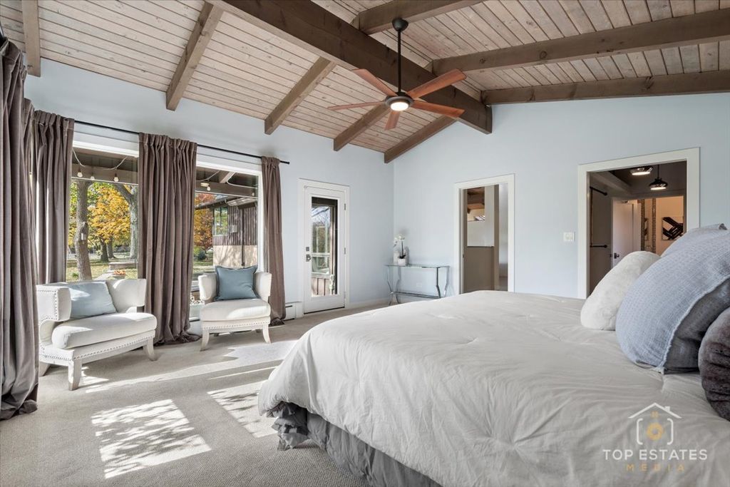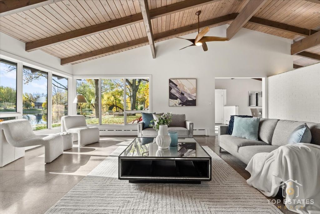 This stunning mid-century modern retreat will make you feel like you're on vacation year-round, perfectly set on over two acres of private waterfront property in the Glenview/Northbrook area. Surrounded by mature trees and lush gardens, this secluded sanctuary offers peaceful water views and four seasons of natural beauty-all just minutes from award-winning schools and a quick commute to downtown Chicago. Thoughtfully updated and meticulously maintained, the home blends timeless design with modern comfort. The welcoming foyer opens to a bright dining area and tranquil walled garden, creating a seamless connection between indoor and outdoor living. The sleek galley kitchen features flat-panel cabinetry, quartzite countertops, a custom glass backsplash, and high-end Wolf and Sub-Zero appliances. The spectacular great room is the heart of the home, showcasing vaulted ceilings, original terrazzo flooring, a gas fireplace, and floor-to-ceiling windows overlooking the raised patio, water fountain, and waterfront-perfect for relaxing or entertaining. The main-floor primary suite offers serene water views, a custom walk-in closet, and a beautifully updated bath. Upstairs, two spacious bedrooms with new carpeting enjoy panoramic views of the property, along with a second full bath and sitting area. The lower level includes a laundry room with a new washer and dryer, ample storage, and access to the two-car garage. This is a rare opportunity to own a private waterfront retreat so close to Chicago.