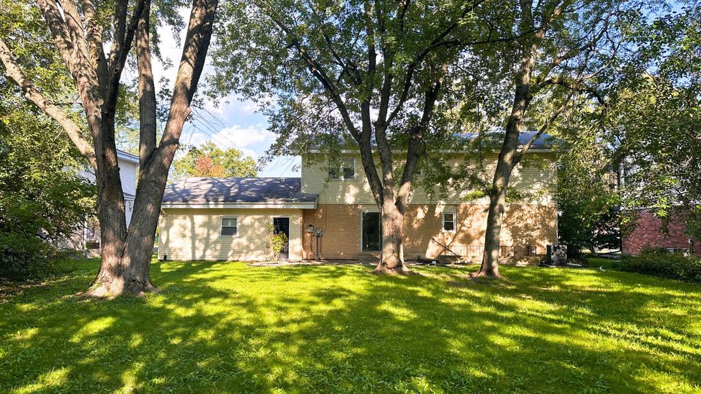 This beautifully maintained 4-bedroom, 2.5-bath home offers over 2,100 square feet of refined living space in a quiet, residential neighborhood. The main level features rich dark hardwood floors, a spacious living area with a wood-burning fireplace, and oversized portrait windows that flood the space with natural light. A stylish half bath adds convenience for guests. The updated kitchen is a true highlight-featuring custom cabinetry, a gas cooktop with oven range, dishwasher, and detailed tile backsplash. Dual sliding glass doors lead directly to a lush, tree-lined backyard offering privacy, space, and shade-ideal for entertaining or unwinding. Upstairs, you'll find hardwood flooring throughout, including a large primary suite with its own full bathroom and walk-in closet. Three additional bedrooms share a full hallway bath, and each room includes ample closet space and large windows for plenty of natural light. The finished basement offers even more living space with tile flooring, a dedicated laundry room, extra storage, and a walk-out stairwell leading directly to the backyard. Additional features include a brick exterior, attached 2-car garage, beautifully kept lawn, and mature landscaping in a peaceful, established neighborhood. This home combines style, space, and functionality-perfect for anyone seeking a move-in-ready property with timeless charm and modern convenience.