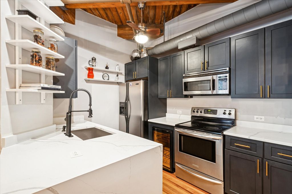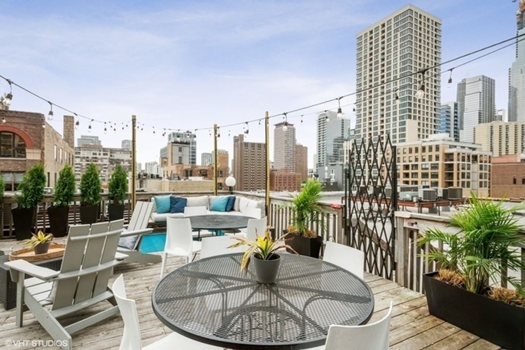 Located in the heart of River North, this 1 bed / 1 bath loft has a great layout featuring exposed brick, timber beams, and hardwood floors throughout giving it a cool urban vibe. The combined living and dining area is bright and inviting. The renovated kitchen boasts sleek quartz countertops with a waterfall edge, stainless steel appliances, a wine fridge, and modern lighting. The large bedroom fits a king bed and has a full wall of closets. The updated bath is spacious and features on-trend tile. Facing Franklin Street, the unit is thoughtfully equipped with soundproof windows and insulated walls, ensuring peaceful living above the city and train. Additional highlights: in-unit laundry, new HVAC (2021), and Nest thermostat. Pet-friendly, professionally managed elevator building with low assessments, doorman, gym, rooftop deck with city views, and extra storage. Steps to dining, shopping, fitness, and transit. Experience the best of urban living!