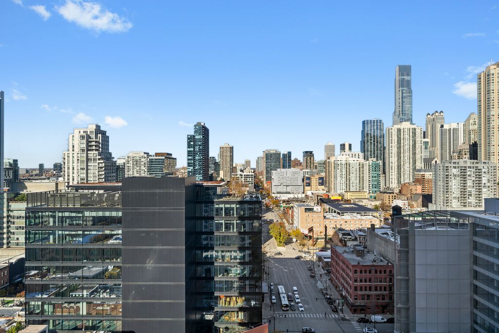 Luxury Corner Residence with Iconic Skyline View & Resort-Style Living. Welcome to Residence 2002 - a custom-designed 2-bed, 2-bath corner home set high above River North with unobstructed North, East, and South views of Chicago's legendary skyline. Floor-to-ceiling corner windows and soaring 9' ceilings flood the space with natural light, while the private balcony offers the perfect setting for grilling, relaxing, or entertaining guests against a breathtaking city backdrop. The stunning chef's kitchen is anchored by a dramatic granite island and enhanced with 42" mahogany cabinetry and professional-grade stainless steel appliances - ideal for both everyday living and hosting in style. Wide-plank hardwood flooring flows seamlessly throughout the entry foyer and the living room, with thoughtfully designed storage including oversized closets in each bedroom. The spacious primary suite boasts a spa-inspired bathroom with designer finishes, premium fixtures, and sophisticated wood cabinetry, offering a tranquil retreat to unwind in luxury. A bright and generous second bedroom provides flexibility for guests, a home office, or both. The convenience of an in-unit washer/dryer complements the home, along with ample storage space. Residents enjoy over 30,000 sq. ft. of five-star amenities, including: * State-of-the-art fitness center * Outdoor pool + hot tub * Fire pits & lounge seating * Sundeck with grilling stations * Package receiving room * Dry cleaning service * 24-hour door staff & security. This is a rare opportunity to own a meticulously crafted residence with postcard-perfect views and world-class amenities - all in one of Chicago's most desirable and vibrant neighborhoods.