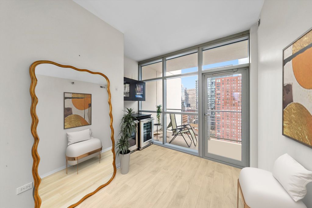 Welcome to Residence 1407 at Silver Tower! Stunning corner 2 bed + den, 2 bath with private balcony and iconic city views. This sleek, sun-filled home features wrap-around floor-to-ceiling windows, showcasing panoramic skyline and sunset views from every room. Enjoy a massive 25-ft south-facing balcony plus west-facing exposure. Open-concept layout with split bedrooms. Chef-inspired kitchen with walnut cabinetry, granite countertops, and premium stainless steel appliances. Expansive living/dining area ideal for entertaining. The primary suite offers a spa-like bath with a double vanity, walk-in shower, and generous closets. Versatile dens function as an office, fitness nook, or dining area. Additional features include wide-plank hardwood floors, an in-unit Front Loader Washer & Dryer, and extra storage. Silver Tower amenities include 24-hour door staff, a state-of-the-art fitness center, a dog run, and a skyline rooftop deck with grills and lounge seating. Unbeatable River North location close to the L, expressways, restaurants, shopping, and nightlife. Indoor heated garage parking is available for $30,000.