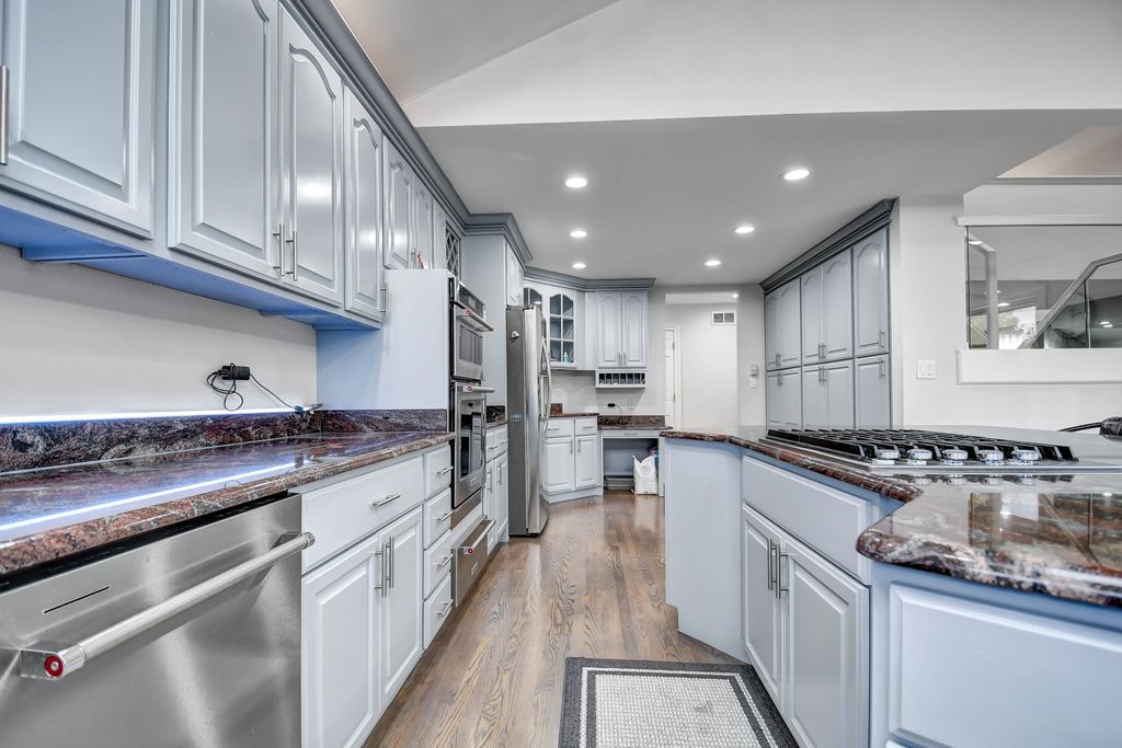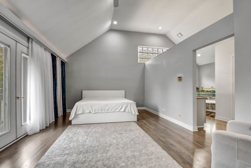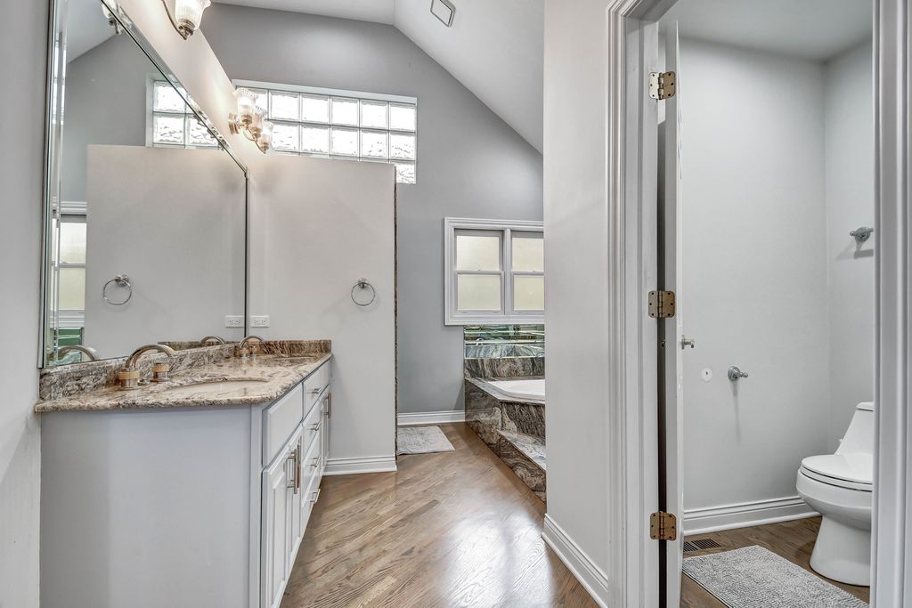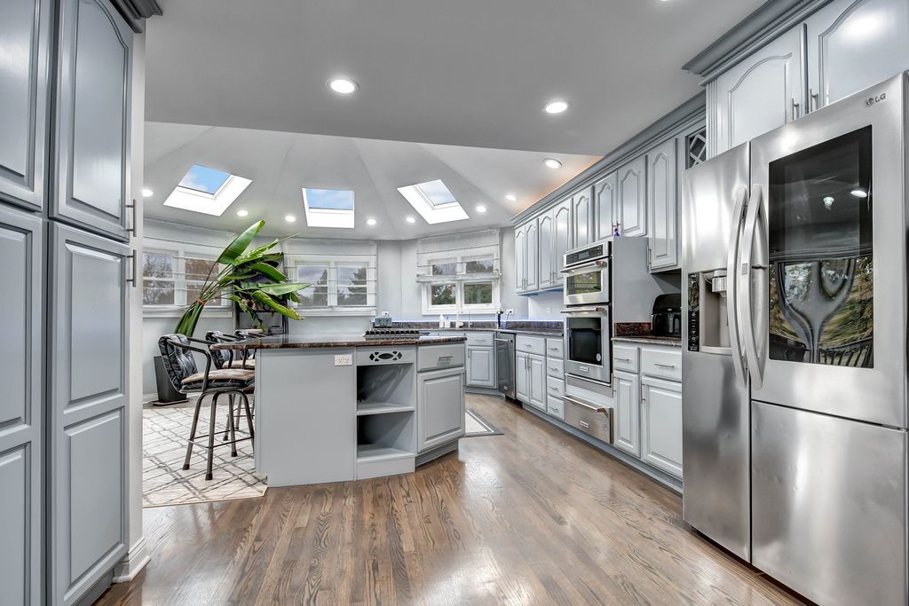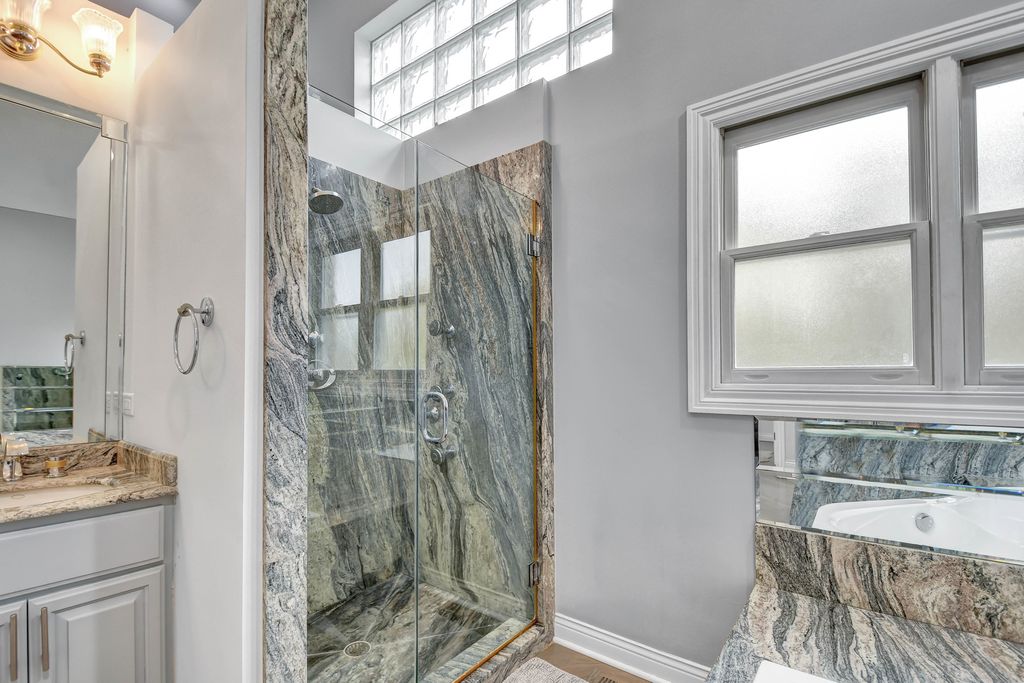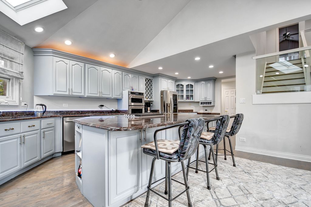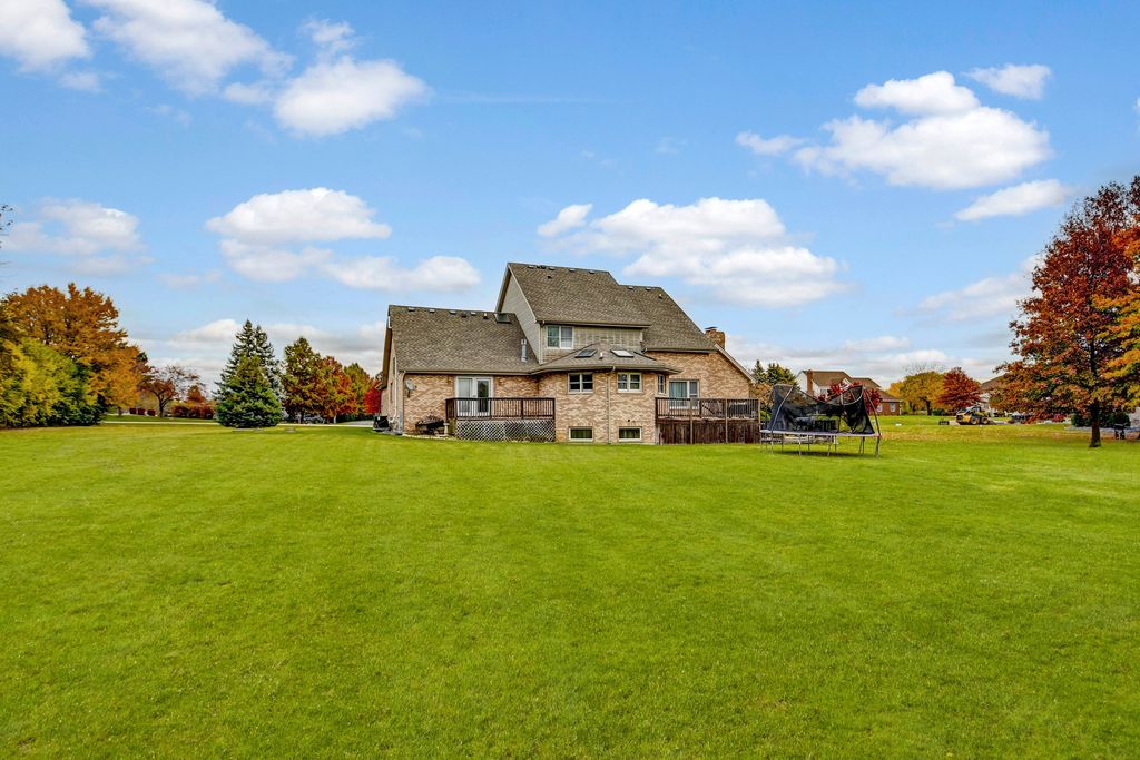 An unconfining design adds a remarkable sense of space to this custom-designed 2-story home, perfectly nestled on a picturesque 1.38-acre lot. Quality built by its previous owner-a custom home builder-this residence offers an open layout ideal for both entertaining and everyday living. The main level features soaring vaulted ceilings, beautifully refinished hardwood floors in modern hues, and a grand 2-story foyer opening to a spacious great room with fireplace. The bright, oversized eat-in kitchen stands out with a turret-style vaulted ceiling, skylights, custom lighting, an abundance of French gray-tinted cabinetry, quality granite countertops, a massive breakfast island, newer stainless steel appliances installed in 2021, and large windows filling the space with natural light. The main-level master suite is a serene retreat with a cozy second fireplace, double doors to a private deck, and a spa-inspired bath showcasing a granite double-sink vanity, corner tub with granite decking, and a matching granite shower with body-spray system, plus a walk-in closet with custom organizers. A private den/office behind French doors completes the main level. Upstairs offers a loft area and three spacious bedrooms with tray or vaulted ceilings, along with a richly appointed full bath featuring a granite double vanity and matching tub surround. The fully finished look-out basement adds even more space, including a recreation room with newer flooring and a third fireplace, an exercise room, a custom-crafted full bath, and a large storage area, with convenient access from both the interior and the garage. Step outside to the expansive deck (needs tlc) overlooking a massive, tree-lined backyard offering peace, privacy, and a natural setting rarely found. The home also features a newer roof (2021). Come see this truly distinctive home, combining timeless craftsmanship, stylish comfort, and recent modern touches.