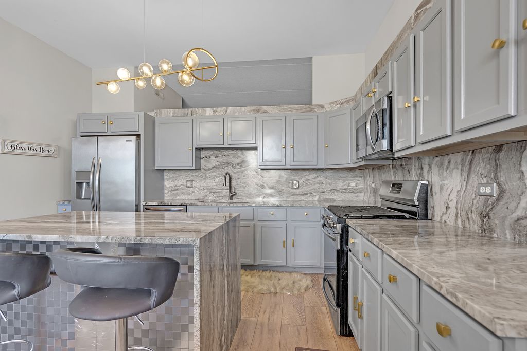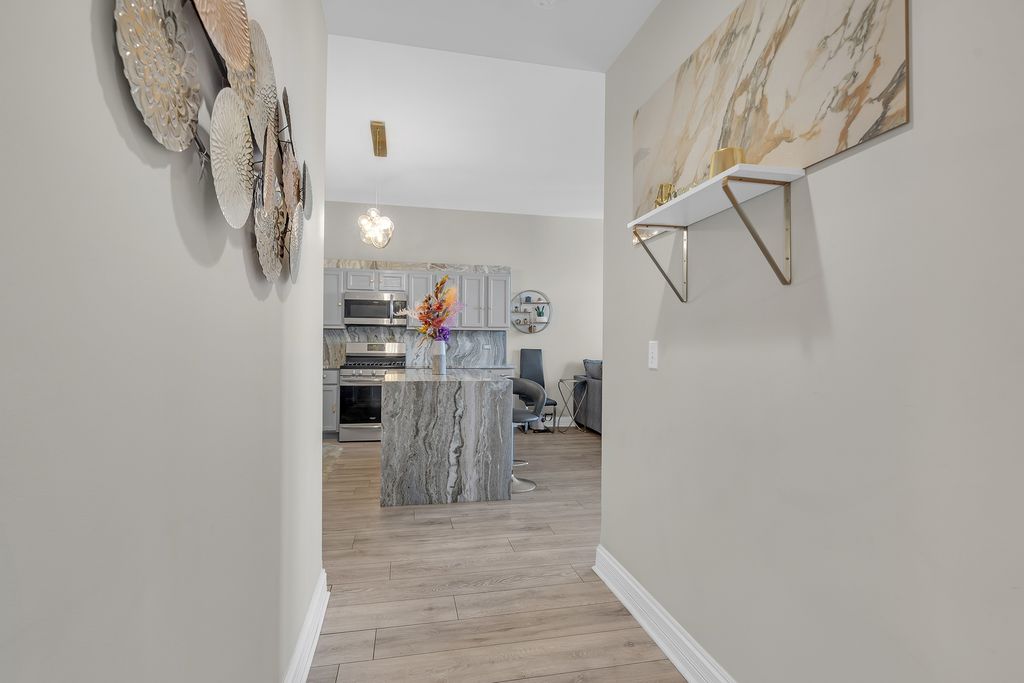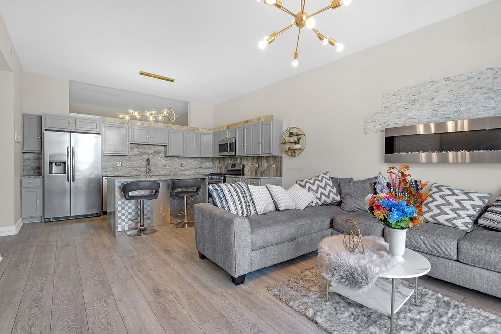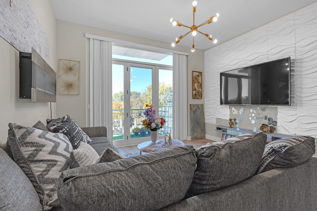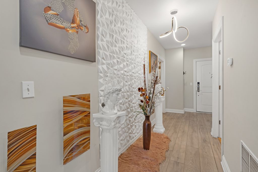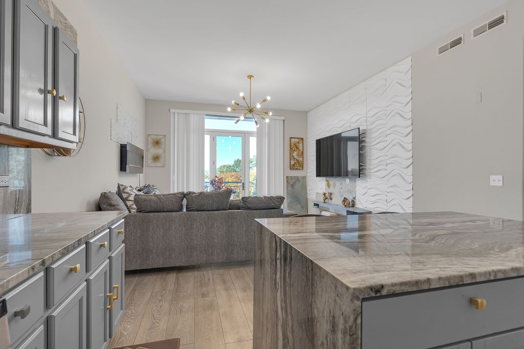 This beautiful and spacious modern condo unit features three bedrooms and two full baths, along with two balconies. The unit boasts 10-foot ceilings and comes with a new in-unit washer and dryer. The custom-made kitchen is stunning, featuring stainless steel appliances, brand new cabinets, and an abundance of granite countertops. The kitchen flows perfectly into the living room, which includes a beautiful modern electric fireplace, creating a warm and comfortable area that seamlessly connects the two spaces. The master bedroom includes an en suite bathroom and a walk-in closet, providing ample storage space. The unit has been professionally and custom painted, showcasing amazing home decor throughout, incorporated into the walls and trim. It truly reflects pride of ownership. Additionally, the unit comes with optional living room furniture, including a couch and bedroom furniture, as well as a TV. Features also include a new roof installed in 2025. The complex offers 24-hour camera surveillance, two elevators, an exercise room, a loading dock for moving, a heated garage, and an assigned parking space (#39) along with a storage space (#40). It is conveniently located near shopping centers, forest preserves, O'Hare Airport, fashion outlets, the hip, Amazon Fresh Market, public transportation, schools, and entertainment options. This is a must-see!