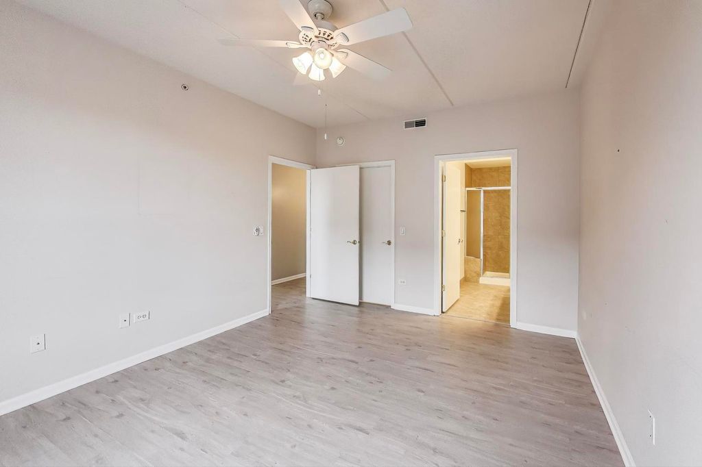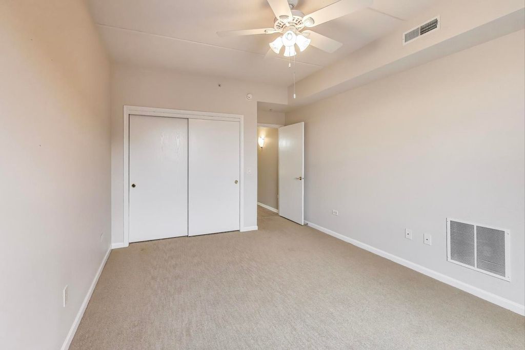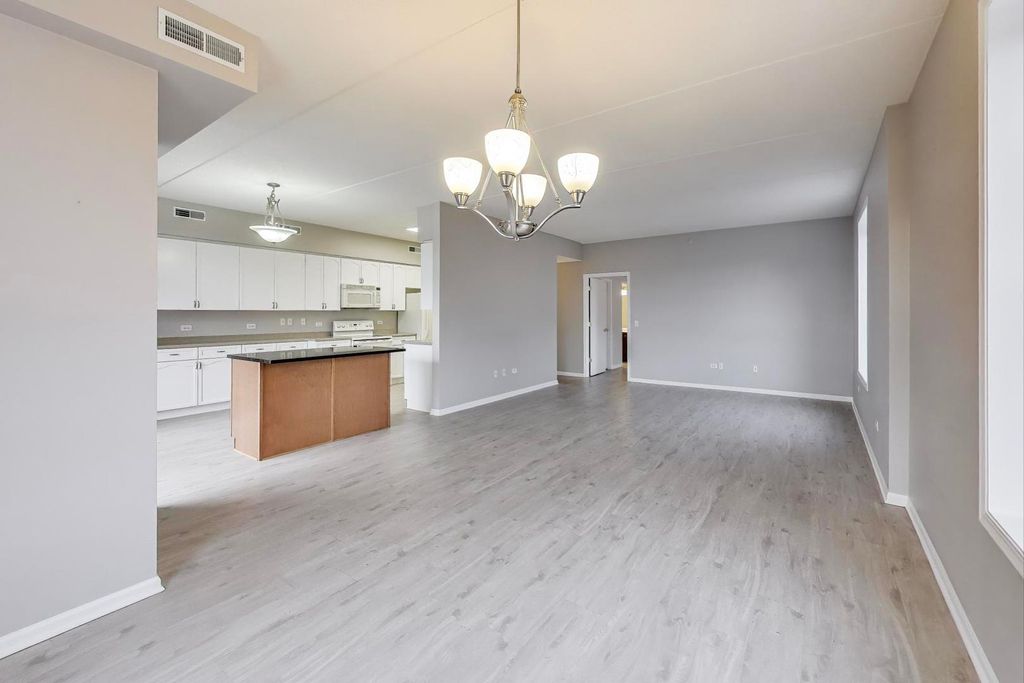 Live in the heart of downtown Palatine! This beautiful sun-drenched 2-bedroom, 2-bath corner unit blends modern style, comfort and convenience. The open-concept layout is filled with incredible natural light from its east and south exposures. The kitchen features new lighting and hardware, along with a custom-designed island perfect for prep, dining or entertaining. The in-unit laundry includes a full-sized washer and dryer plus added shelving for extra storage. Luxury vinyl plank flooring flows seamlessly throughout, adding warmth and easy care. Spacious balcony for gardening, sunning or grilling. Enjoy maintenance-free living with a heated underground garage space and a large private storage unit. All of this is just 1/4 mile from dining, shopping, and the Metra, making this home the ideal combination of modern updates and downtown living.