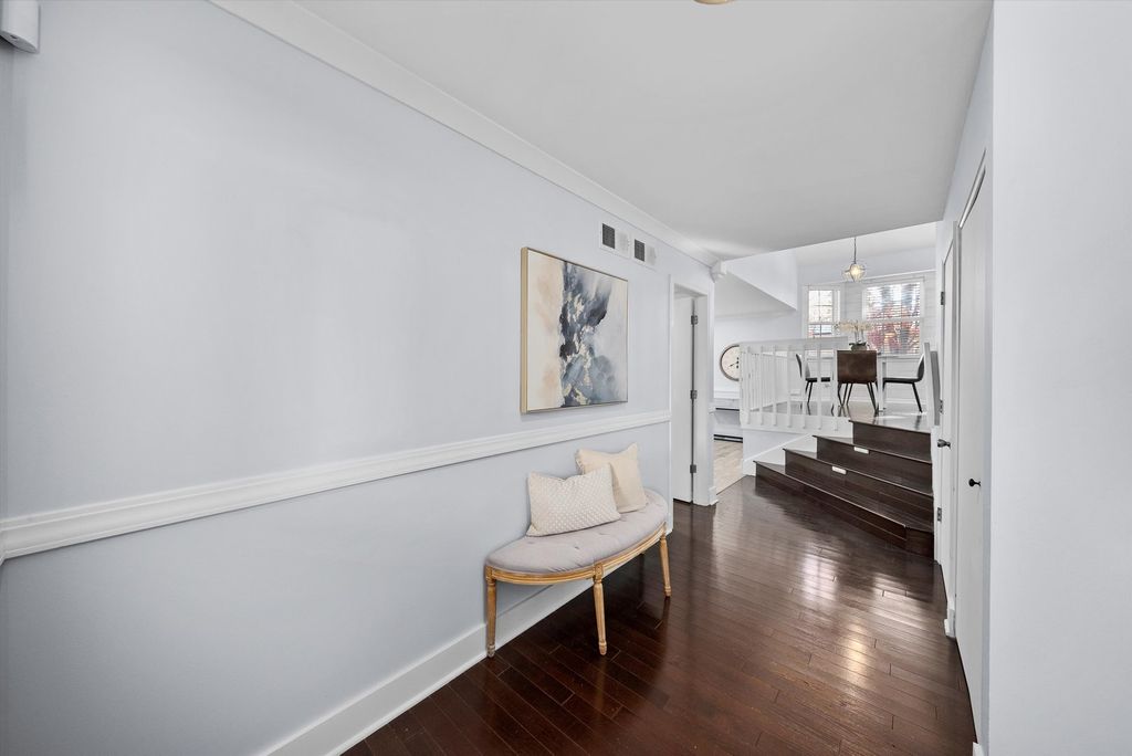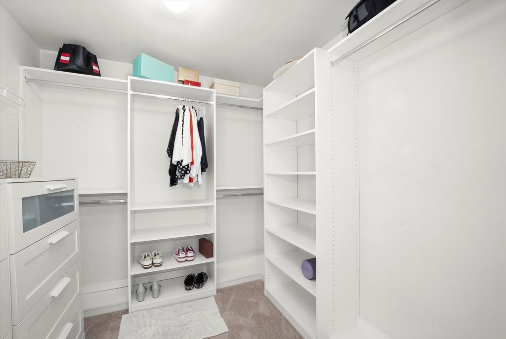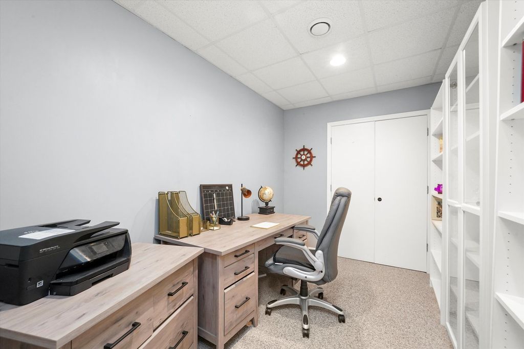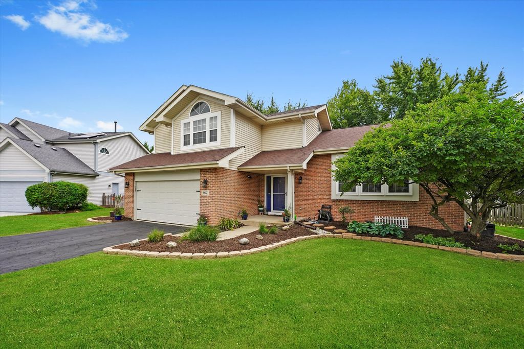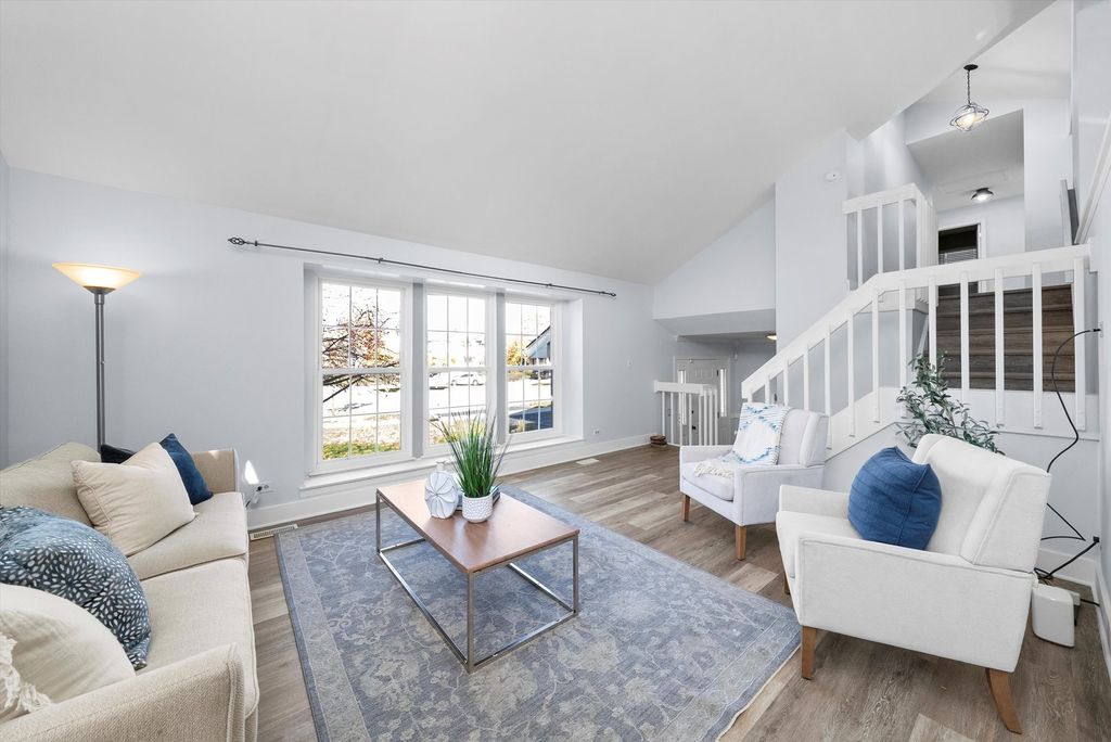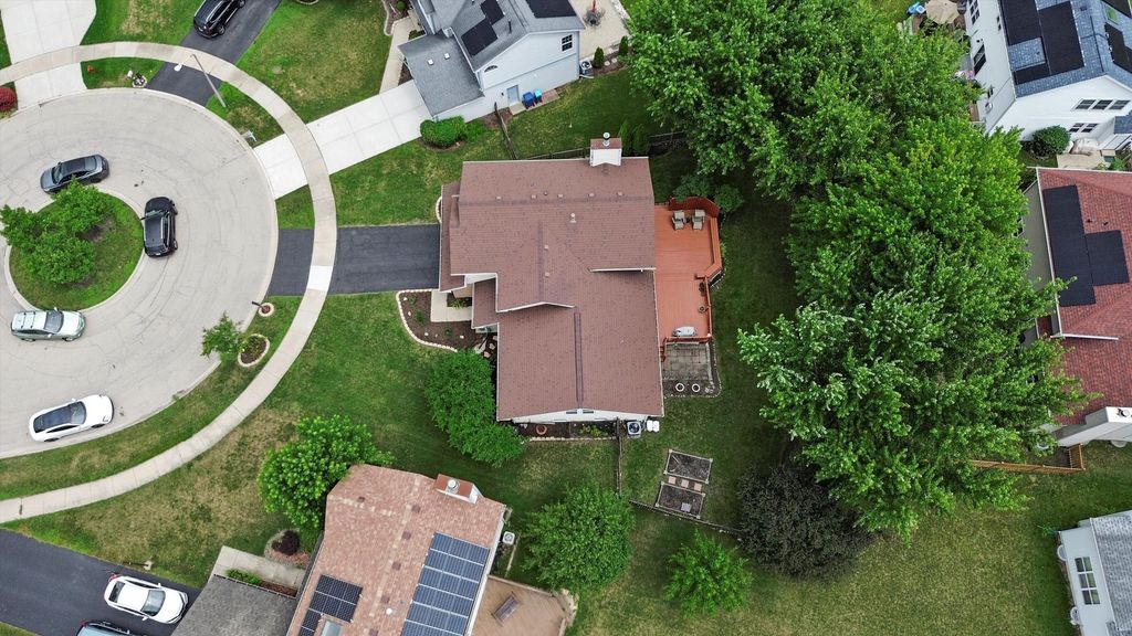 Luxury living on a quiet cul-de-sac with vaulted ceilings, designer updates, and an entertainer's dream basement! Features include mocha hardwood floors, dramatic vaulted living/dining areas, and a bright kitchen with granite counters, SS appliances, white cabinetry, and pantry. Family room offers, a gas-start brick fireplace, and access to a two-tiered deck overlooking a serene, tree-lined backyard. The vaulted primary suite boasts a spa-like bath with soaking tub, dual vanities, separate shower, and WIC. Finished basement includes media area with projector/screen & surround sound, office, and flexible rec/storage space. Major updates: (2025) vinyl flooring in family room, dining room, living room, stairwell and hallway, roof (2022) sump pump (2020), furnace & deck (2019), smart Ecobee thermostat. Walk to park, pond, school, and shopping!