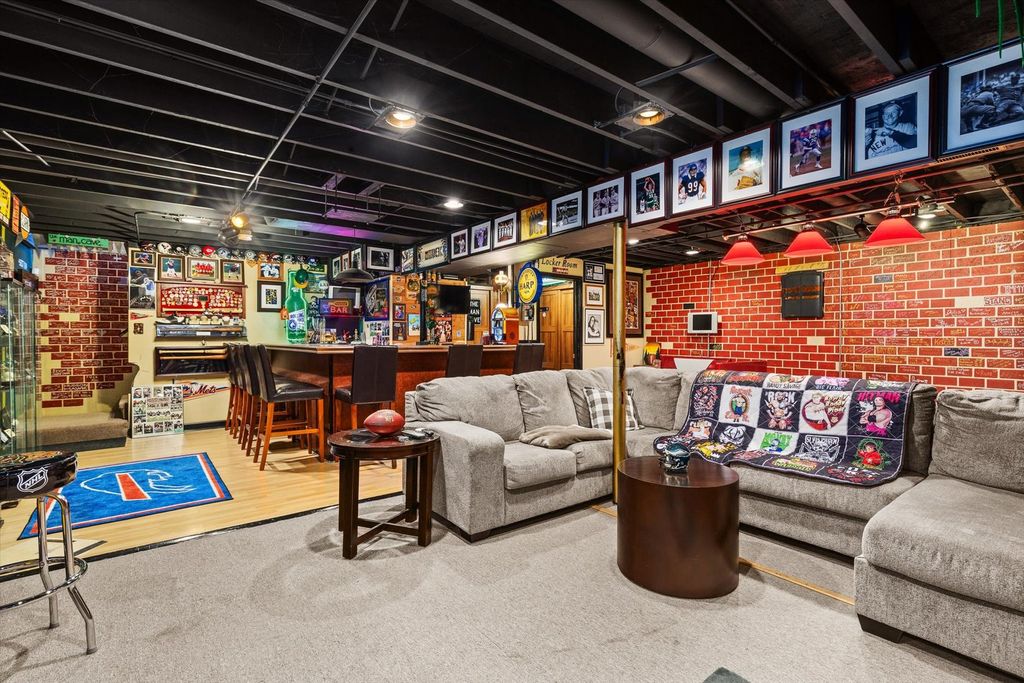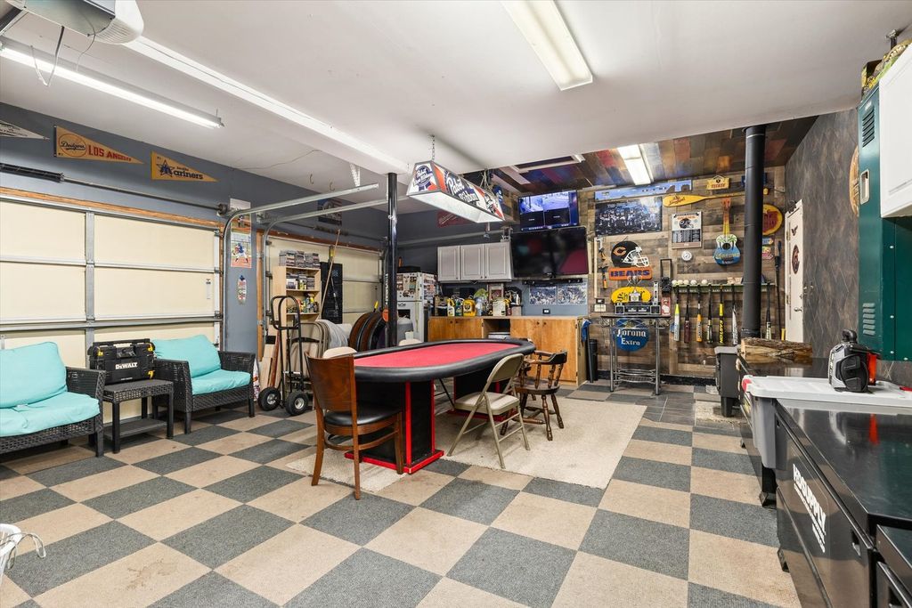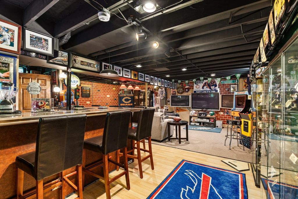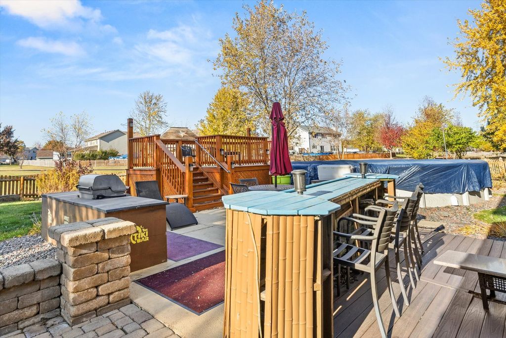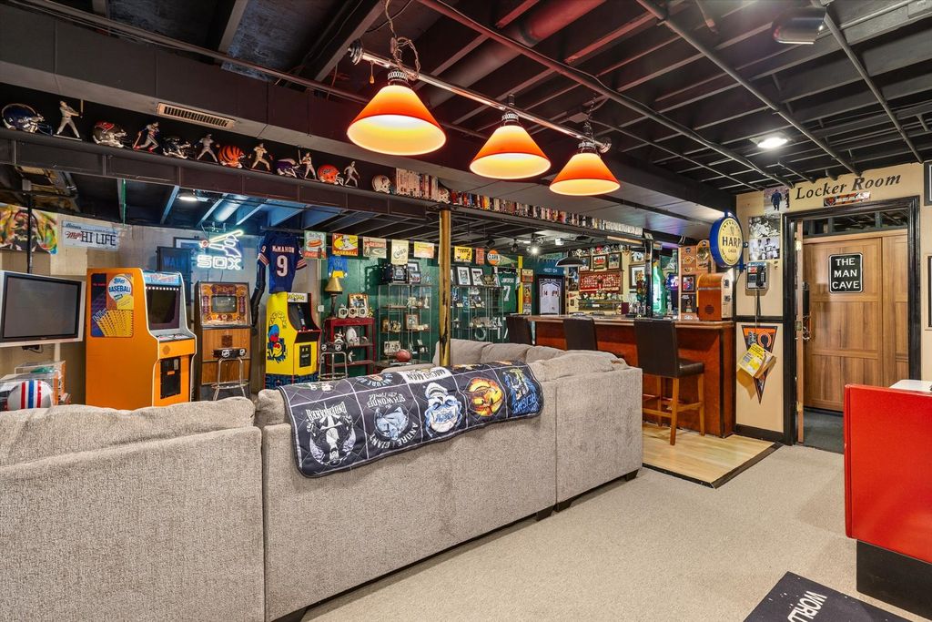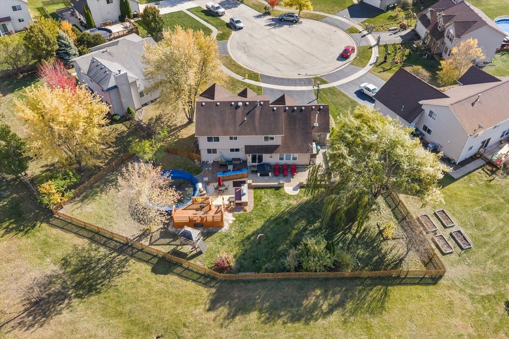 Spacious and inviting, this 4-bedroom home offers 2 1/2 baths, a fully finished basement designed for entertaining, and an incredible backyard oasis. The sunken family room impresses with open ceilings, a brick accent wall, and a built-in projector and screen-perfect for movie nights at home. The kitchen features a large island and stainless steel appliances, with the stove, refrigerator, and dishwasher replaced within the last two years. The original dining room is currently used as a home office, both the office and living room have been updated with luxury vinyl plank flooring. Upstairs, you'll find four generous bedrooms, a 19x13 loft overlooking the family room, convenient second-floor laundry, additional bathroom and a spacious 13x16 primary suite with full, private bath. The finished basement is a true gathering destination, complete with a full bar (seating for seven), multiple TV setups, lounge spaces, a bathroom urinal, utility/storage room, Drylok walls, and upgraded electrical featuring a 200-amp service with a 100-amp subpanel. The massive three-car garage is also finished and adaptable for workshop or entertaining use, featuring carpet tile flooring, televisions, and a wood-burning stove. Step outside to your private outdoor retreat. Enjoy the pool with a 20x10 deck, beautifully landscaped yard, and a 62x29 multi-surface patio combining paver, concrete, and maintenance-free materials. Additional outdoor amenities include a built-in grilling station with bar seating, hot tub, fire pit, and lounge areas. The oversized, fully fenced yard backs to open green space and a pond-providing privacy and serene views. Additional features include 3/4" plywood flooring in attic storage areas, all mounted flat-screen TVs included, and a NEW furnace and air conditioner. This home combines everyday comfort with the amenities of a private entertainment retreat-inside and out.