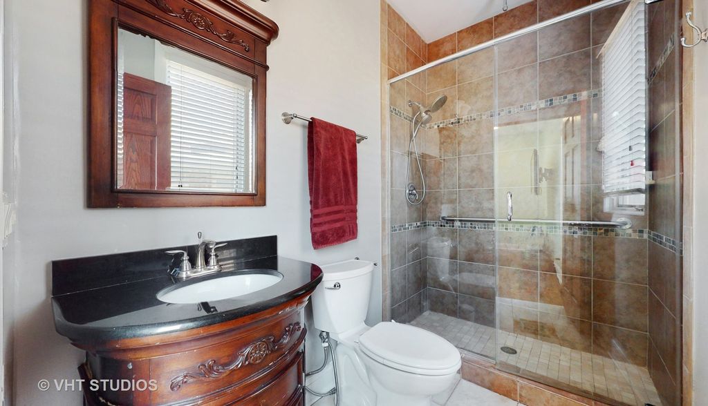 Welcome to this stately custom brick home, where timeless craftsmanship meets modern comfort. A dramatic two-story foyer with custom chandelier sets the impressive tone, opening to an exceptional floor plan designed for everyday living and effortless entertaining. The spacious living and dining rooms flow into a stunning family room featuring vaulted ceilings, a cozy gas fireplace, and direct access to the outdoor entertaining space. At the heart of the home is the chef's kitchen, complete with custom white cabinetry, quartz countertops, stainless steel appliances, a center island with breakfast bar, and a convenient butler's pantry. Perfect for hosting or enjoying a quiet morning coffee, this space is both beautiful and highly functional. The first-floor primary suite offers a luxurious private retreat with dual walk-in closets and a spa-inspired ensuite with double vanities, a soaking tub, and an oversized shower. A second main-level bedroom adds ideal flexibility for guests, a home office, or playroom. Upstairs, three generously sized bedrooms each offer their own updated ensuite bath, walk-in closet, and access to additional storage. The fully finished basement enhances your living space with a large recreation room, home theater, and a private bedroom with full bath-perfect for teens, in-laws, or long-term guests. Outside, enjoy an oversized lot complete with a patio and basketball court, plus a two-car attached garage and an additional detached two-car garage. Ideally located near top-rated schools, shopping, dining, and more, this exceptional home truly has it all.