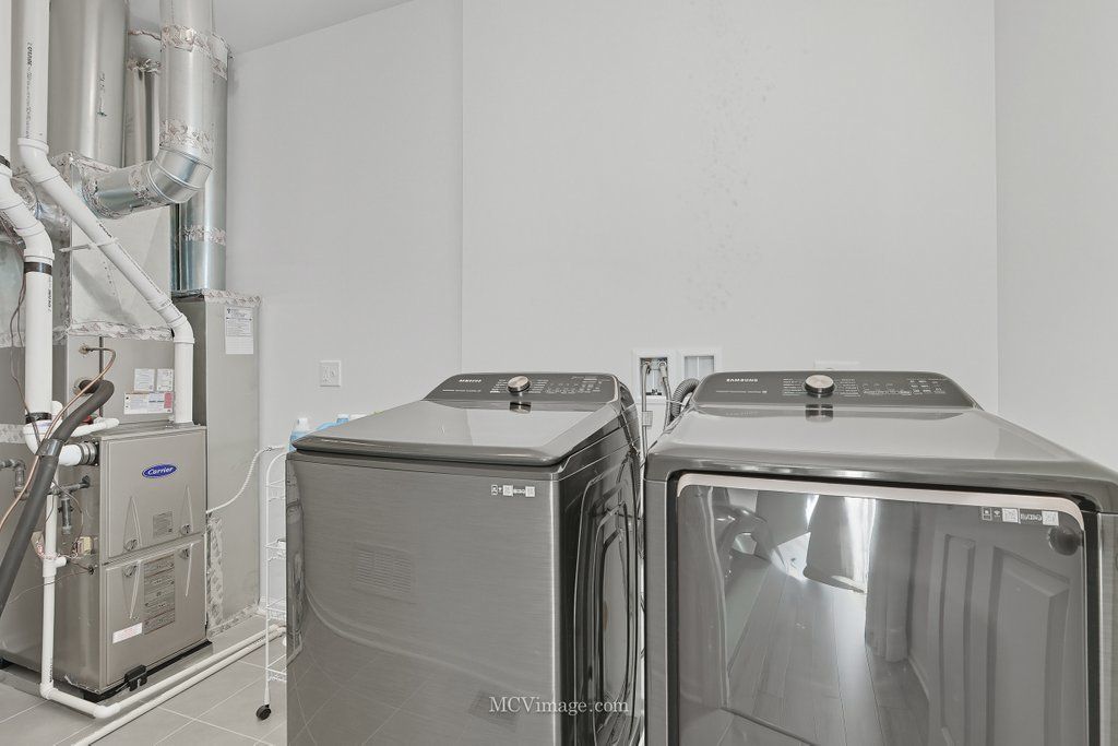 This bright and modern townhome is only 3 years young and shows like new! Step inside and be welcomed by the dramatic two-story great room, where tall ceilings, expansive windows, and stylish LVP flooring create an inviting atmosphere with abundant natural light. The front of the home overlooks a well-kept green space, providing a serene and inviting view. Designed with both function and style in mind, the kitchen features 42" upper cabinets, granite countertops, a center island, stainless steel appliances, and a sleek Moen pull-down faucet - perfect for everyday living and entertaining. In addition to the kitchen, the main level includes a convenient laundry room equipped with upgraded Smart Washer and Dryer, as well as a stylish powder room. Upstairs, both bedrooms offer walk-in closets and private ensuite bathrooms, ideal for guests or roommates. Both bathroom showers include upgraded handheld showerheads. Throughout the home, enjoy custom window treatments, including blackout shades in the bedrooms for added comfort and privacy. This home includes an industry leading 10 YEAR TRANSFERRABLE STRUCTURAL WARRANTY as well as many smart home features - Ring Video Doorbell, Echo Dot Smart Speaker, Honeywell Smart Thermostat, My Q compatible Chamberlain garage door opener, Omada Wi-Fi Booster, and a media hub enclosure in the lower-level closet to keep everything neat and tidy. This bright and airy townhome offers low-maintenance living with high-end finishes - don't miss the opportunity to make it yours!