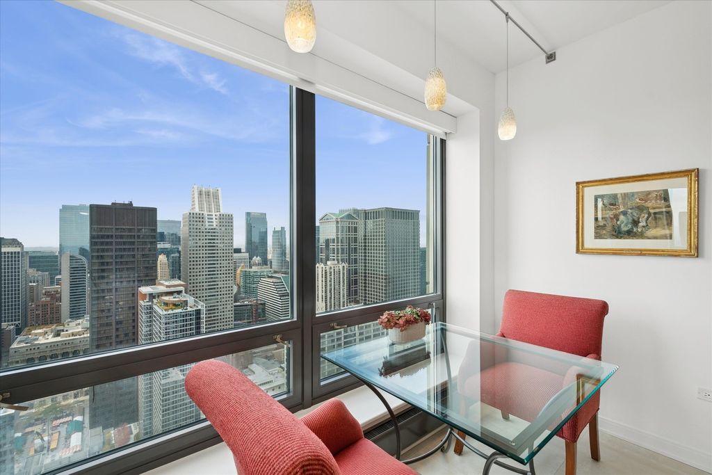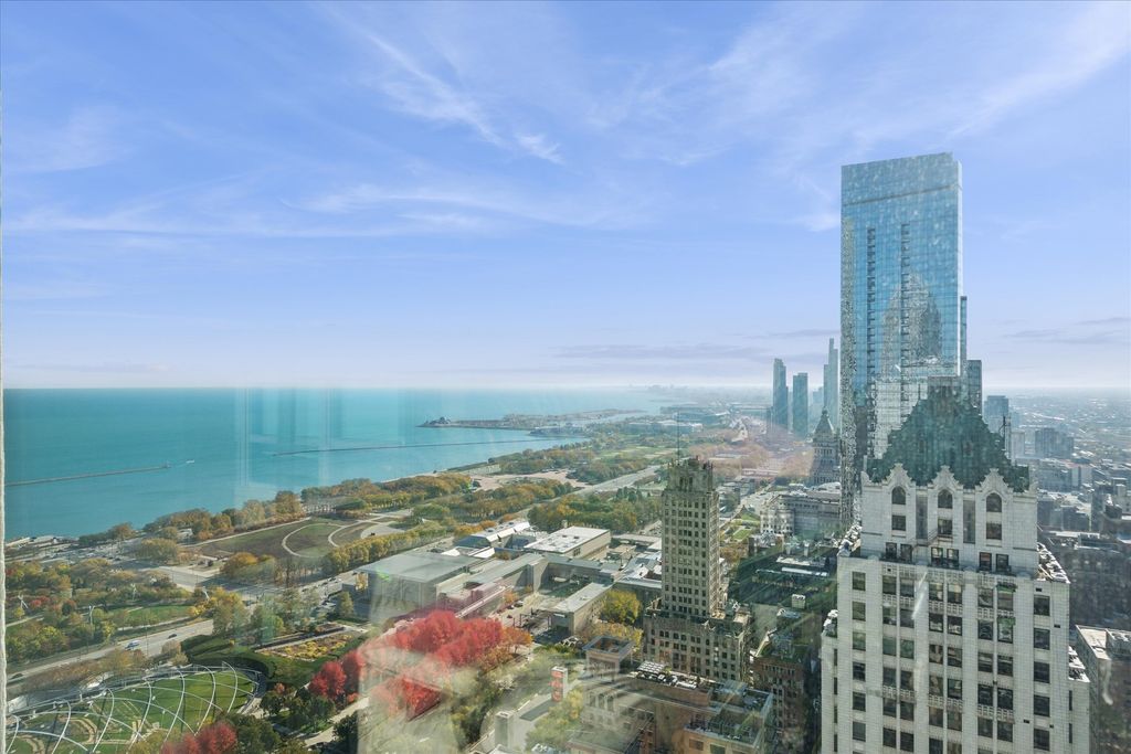 Enjoy stunning panoramic views of Lake Michigan, Millennium Park, the Bean, Buckingham Fountain and the city lights from this beautiful 52nd floor 3 bedroom home with corner windows at the Heritage at Millennium Park! Inviting foyer entry leads to spacious living and dining rooms with spectacular east, south and west views! Renovated chef's galley kitchen with breakfast area has 42" cabinets, granite countertops, subway tile backsplash, undermount sink, stainless appliances, gas cooktop and large pantry closet. Spacious master suite with huge walk-in closet. Lovely renovated marble master bath with dual vanity, large walk-in shower with bench and linen closet. 2nd bedroom redesigned as a den/office with beautiful built-in desk and shelves. Spacious 3rd bedroom has great city and sunset views. Sizeable closets with custom interiors and doors. Motorized shades and custom lighting throughout. Side-by-side washer & dryer. Gleaming hardwood floors throughout. Private, recessed balcony with beautiful city and sunset views. Full-amenity building with 24-hour door staff, on-site management, hospitality room, indoor pool, fitness center, 3 terraces, dog run, storage, and direct access to Chicago's underground pedway which provides west access to Daley Plaza and east access to the Aon and Prudential buildings, in addition to underground access to Chicago's El transportation system. Walk to Lake Michigan, Millennium Park, restaurants, transportation, shopping, museums, theater and more! Deeded parking spaces 4-66 and 7-28 included.
