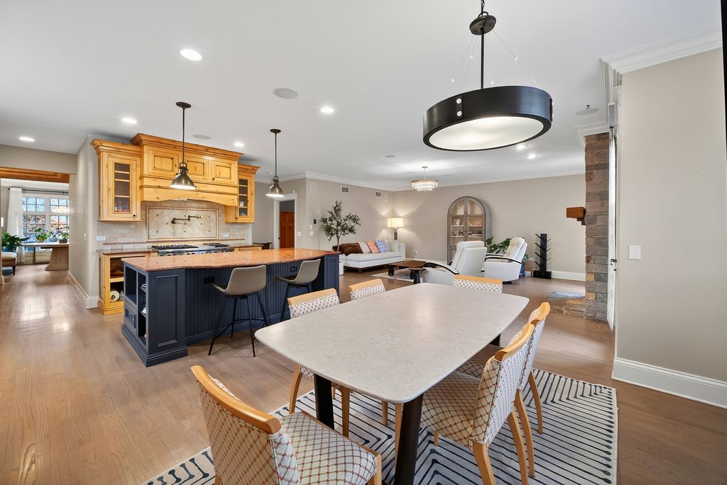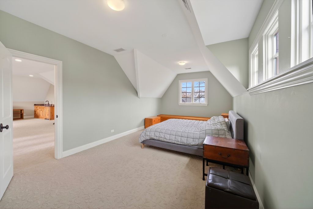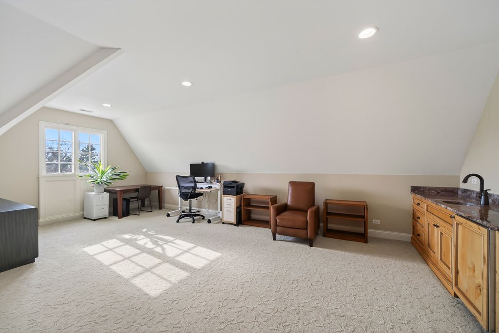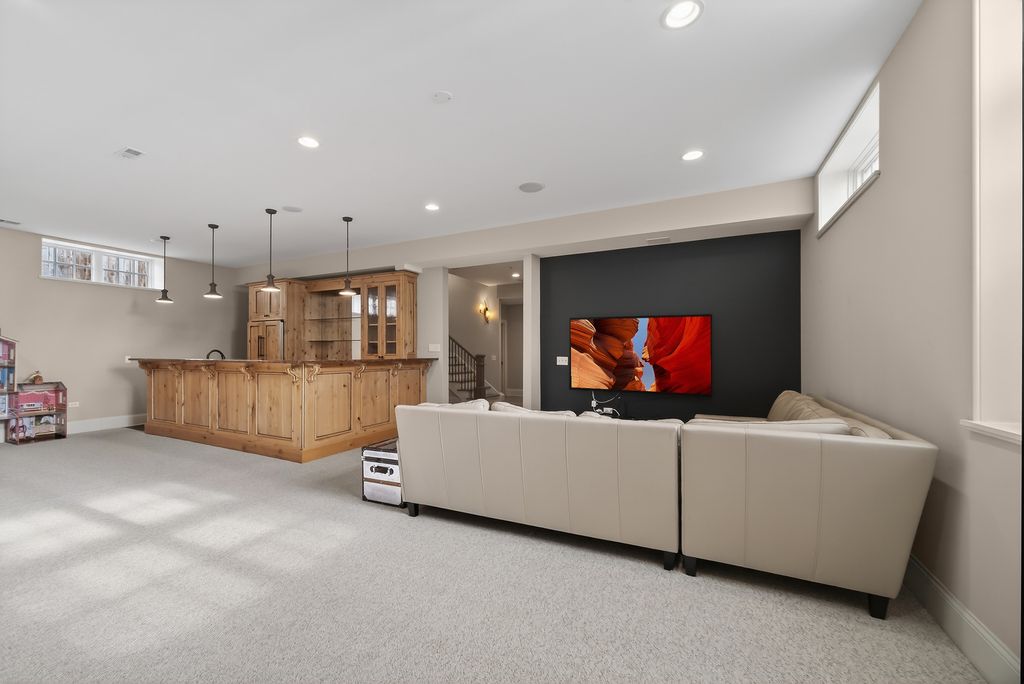 Perched at the top of the hill on highly sought-after Julian Street, this stunning custom residence offers timeless architecture, exceptional craftsmanship, and an unbeatable walk-to-downtown Naperville location. A welcoming covered front porch and impressive curb appeal introduce this stately home, thoughtfully designed for elegant entertaining and comfortable everyday living. The interior is flooded with natural light and showcases recently refinished hardwood floors throughout in a sophisticated light stain, complemented by updated lighting and refined finishes. The main level features a gracious living room and formal dining room, ideal for gatherings, along with an updated powder room. At the heart of the home is the chef's kitchen, impeccably appointed with custom Knotty Alder cabinetry, a paneled Sub-Zero refrigerator, two Sub-Zero refrigerator drawers, Wolf range with pot filler, paneled Bosch dishwasher, built-in pantry, and expansive granite countertops. A dedicated bar area with a striking barreled ceiling and wine storage flows seamlessly into the family room, where a beautiful stone fireplace anchors the space and walls of windows bathe the home in natural light. A private first-floor office features Knotty Alder wood trim, built-in desk, and custom cabinetry-an ideal work-from-home retreat. Upstairs, the primary suite enjoys its own private wing, offering a serene retreat with a spacious walk-in closet and a luxurious bath featuring dual vanities and refined finishes. Two additional bedrooms share a well-appointed shared bath, while a fourth bedroom offers the privacy of its own en suite. The convenience of a second-floor laundry area completes this level. The third floor provides exceptional flexibility, featuring a private fifth bedroom with a full bath and an expansive open space-perfect for a game room, additional family room, media lounge, or creative retreat. The deep-pour finished basement impresses with tall ceilings and outstanding versatility. Designed for entertaining and function, it includes a full bar with Knotty Alder cabinetry, granite counters, JennAir full-size refrigerator, Bosch dishwasher, and microwave. A striking stone fireplace with gas insert creates a warm gathering space, complemented by an open staircase that enhances the home's architectural flow. This level also features a fully updated full bath, a spacious second laundry room, extensive storage, dual furnaces, and two water heaters. Outdoor living completes the experience, offering inviting spaces to relax or entertain, surrounded by mature landscaping and an outdoor fireplace. Located just steps from Highlands Elementary, North Central College, downtown shops, restaurants, and the Riverwalk, this extraordinary home blends luxury, layout, and location-a rare opportunity to experience Naperville living at its finest.