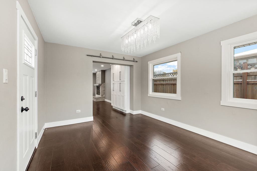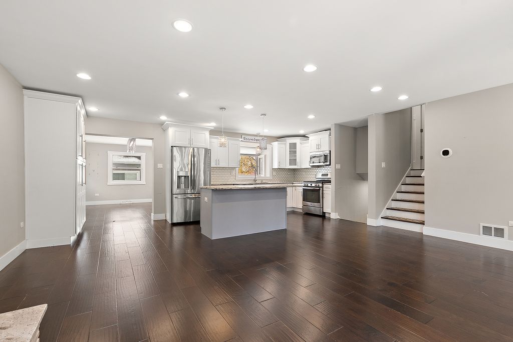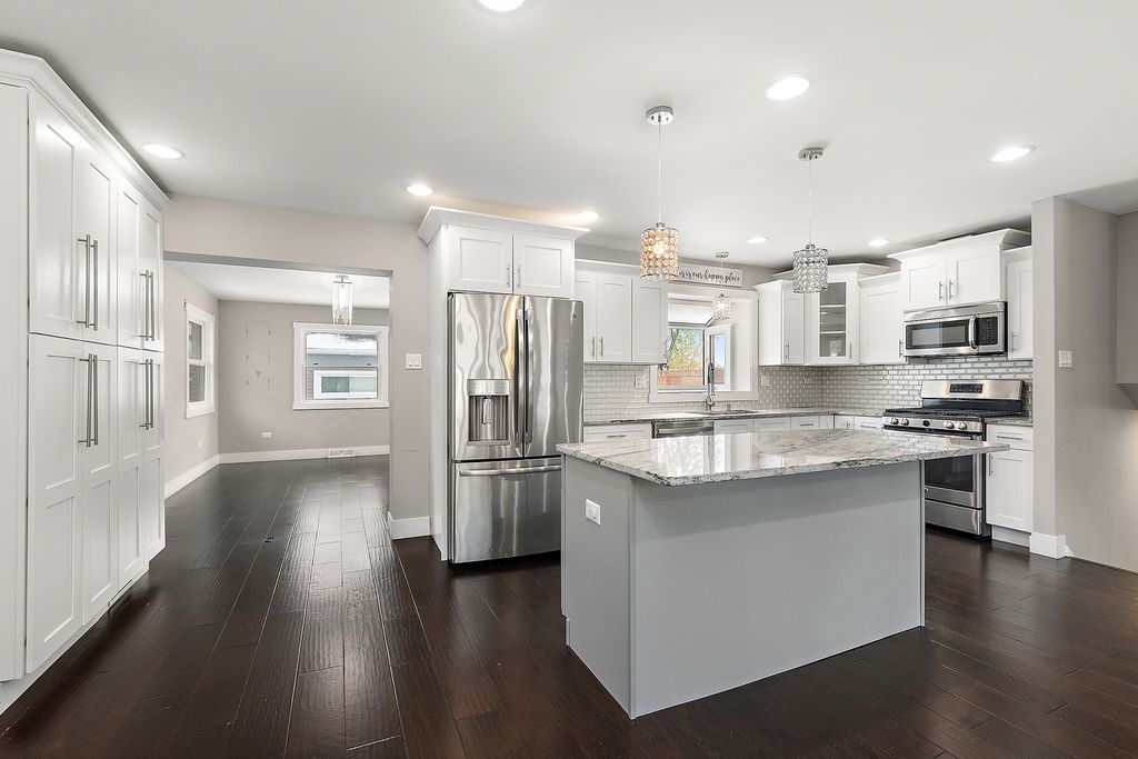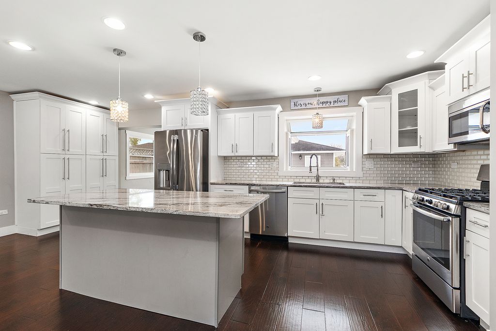 Welcome home to this beautifully updated oversized split-level in Justice, offering nearly 1,400 square feet of living space plus a spacious lower level for extra comfort and functionality. Updated in 2019, this home combines modern design, warm finishes, and a versatile layout perfect for today's lifestyle. Step inside to a bright open-concept living area featuring a cozy fireplace and large windows that fill the space with natural light. The living room flows seamlessly into the updated kitchen, which showcases white cabinetry, stainless steel appliances, a large island with breakfast bar seating, a wall of pantry storage, and a stylish tile backsplash. A window over the sink offers a peaceful view of the backyard, and just off the kitchen, you'll find an additional flex room that can serve as a dining room, sunroom, or home office-the perfect spot to relax or entertain. The lower level provides even more living space, featuring a comfortable family room with wood laminate flooring, a full bath with an updated vanity, and modern fixtures that make this area ideal for gatherings or overnight guests. Upstairs, you'll find three bedrooms with dark wood laminate flooring and a full main bath that includes a double vanity, tiled shower/tub combo, and updated finishes, creating a space that feels both stylish and functional. Step outside to enjoy the oversized deck, perfect for summer barbecues or quiet evenings under the stars. The large, fully paved driveway leads to a detached 2.5-car garage with an attached storage shed, giving you plenty of space for vehicles, tools, and equipment. The private backyard offers a beautiful open view with no neighbors directly behind, enhancing your sense of peace and privacy. Conveniently located just down the street from a park and the local library and around the corner from an elementary school, this home provides easy access to everything your family needs. With its combination of space and location, this Justice home is the perfect blend of comfort and convenience. Don't delay, show today!!!!!