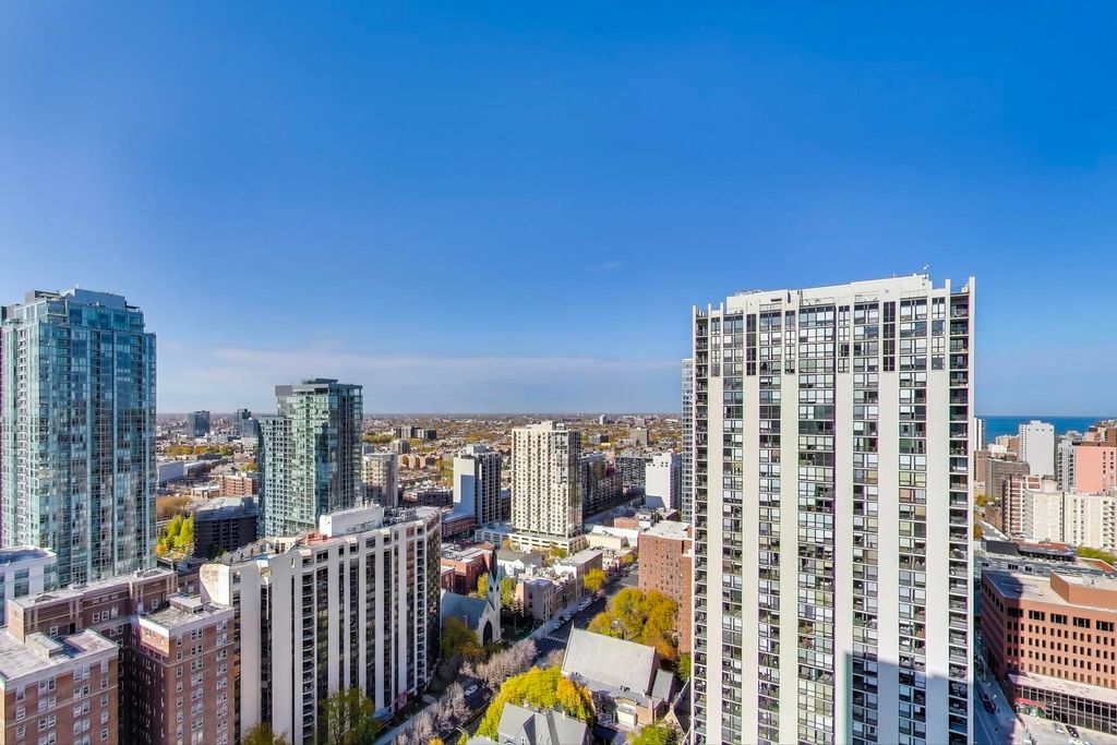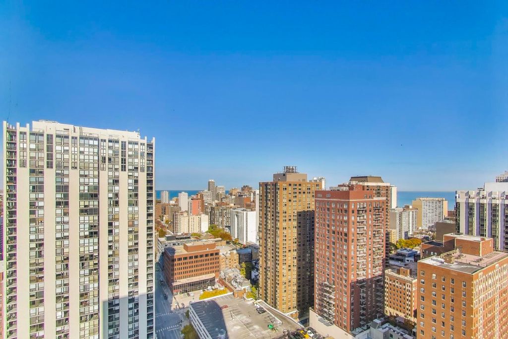 You will LOVE coming home to this High-floor split 2 bed/2 bath residence with IN-UNIT washer/dryer and garage parking included! Gracious entry foyer leads to open floorplan, tastefully updated luxury finishes throughout. Hardwood floors, floor to ceiling windows filled with natural light capture postcard lake and city views from EVERY room. The modern kitchen, a chef will love, all stainless steel appliances, granite countertops, a full slab granite backsplash. Relax in open living room dining area perfect for entertaining. Both bathrooms have been refreshed with updated fixtures, brand new shower heads, medicine cabinets, and modernized sinks and faucets. The primary en suite offers a luxurious granite and frameless glass shower. Step onto your private balcony to take in expansive North, East, and West exposures - the perfect spot to unwind above the city. Additional highlights include a brand new living room HVAC unit (installed June 2024), generous bedroom sizes, abundance of closet space. Enjoy unparalleled convenience with 24-hour door staff, on-site management and maintenance, package receiving, and access to the rooftop sun deck. Residents also benefit from direct access to the premier Fitness Formula Club (FFC) offering state-of-the-art amenities including a pool, basketball court, pickleball, Pilates, group classes, personal training, sauna, spa services, and a cafe. One deeded garage parkin space included. Ideal location just steps from CTA bus routes, Red Line. Walk to everything grocery stores, cafes, great restaurants, parks, and lake/Oak street beach! Investor-friendly and pet-welcoming building with low monthly assessments that include basic cable and internet. This move-in ready home puts you in the heart of the Gold Coast.