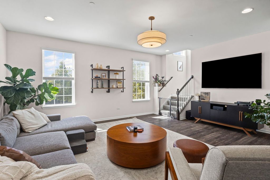 Set in the sought-after Woodview community, this stylish townhome offers over 2,200 square feet of modern, low-maintenance living in an unbeatable Woodridge location close to Naperville, Downers Grove, and Lisle. Inside, an open-concept main level creates an ideal flow for everyday life and entertaining, with a generous living and dining space that connects to a designer kitchen featuring rich espresso cabinets, quartz countertops, a large island, and stainless steel appliances. Upstairs, you will find two spacious bedrooms, including a serene primary suite with two walk-in closets and a private bath with double sinks and a walk-in shower. A large loft on this level adds valuable flexible space and works beautifully as a home office, media lounge, homework area, or cozy reading retreat. On the first floor, a generous recreation room extends your living space even further. This bright, finished area is perfect for a dedicated home office, fitness room, playroom, or second family room, so everyone can spread out and have their own zone. The attached, expanded 2-car garage provides excellent storage and everyday convenience, and it is already wired for an electric charger, a smart upgrade for current or future EV owners. A 2024 water softener is another thoughtful update that keeps the home feeling fresh and well cared for. Everyday living is made easier with main-level laundry and extra storage, high ceilings, recessed lighting, and energy-efficient construction that includes Energy Star certification and water-saving fixtures to help keep utilities in check. Exterior maintenance, lawn care, and snow removal are all handled by the association, so weekends can be spent enjoying nearby shopping, restaurants, parks, and convenient access to commuter routes and public transportation. Served by highly rated District 68 and District 99 schools, this move-in-ready 2-bedroom townhome with a spacious loft and versatile first-floor recreation room is a rare find that combines size, style, and a truly convenient suburban location.