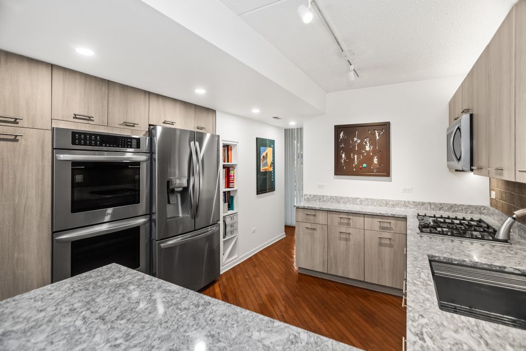 Exceptional North Pointe townhouse with sweeping views of the beautifully landscaped pond, offers one of the best locations in the community. This updated 3-bedroom, 2.1-bath home features hardwood floors throughout and a DDK-designed kitchen with quartz countertops, stainless steel appliances, double oven, breakfast bar, and plentiful storage. The open living/dining room is ideal for entertaining and opens to a private patio overlooking the water. An updated half bath completes the first floor. The second level includes a spacious bedroom, updated hall bath, laundry, and a bright, pond-facing primary suite with a walk-in closet and updated bath with walk-in shower. The top floor offers a third bedroom, perfect for an office or work-from-home space, and a family room with a gas fireplace and terrace that overlooks the pond. The lower level provides excellent storage. Two heated garage spaces with an EV hook-up, an indoor heated pool, and a fitness room complete this unique offering. Walk to Walgreens, CVS and Starbucks. Close to I-94, Old Orchard, and Central St. shops.