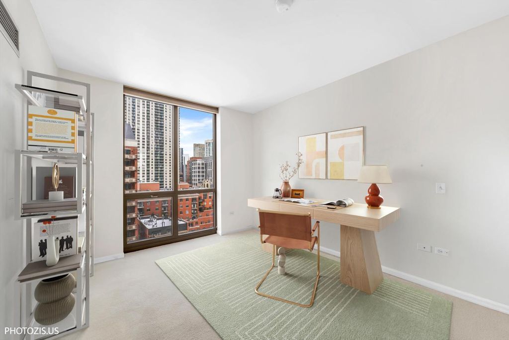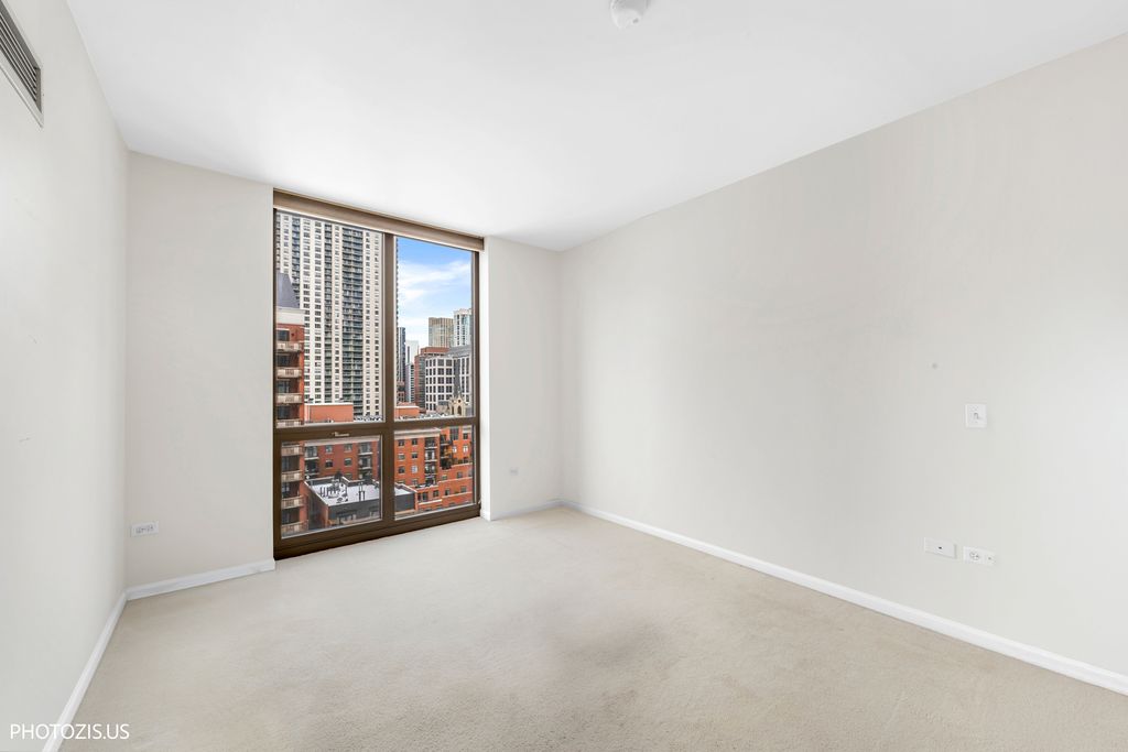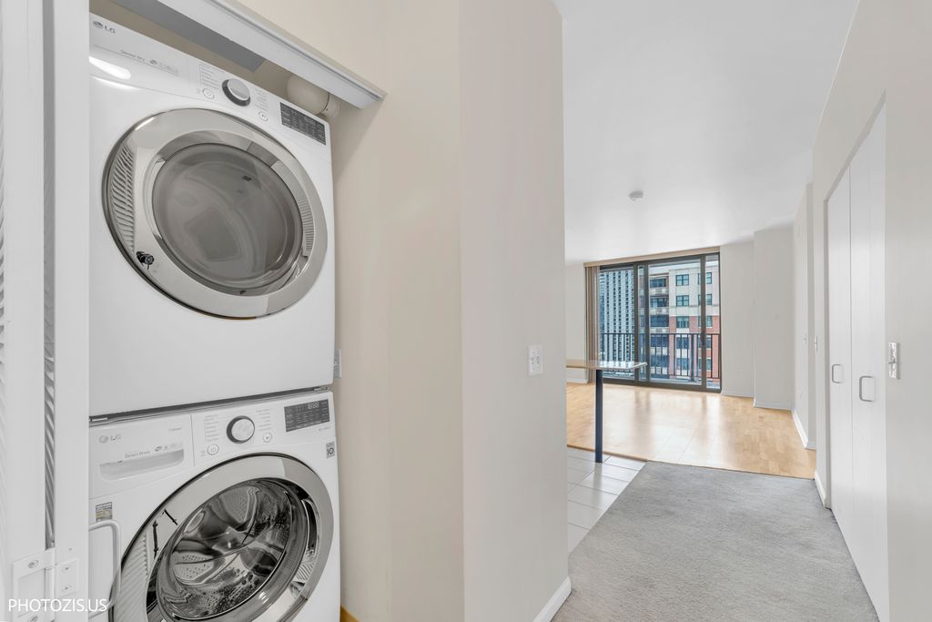 This bright and spacious condo features stunning floor-to-ceiling windows that flood the space with natural light. The convenient layout includes a primary bedroom with an en-suite bathroom featuring a double vanity, plus a guest bathroom for added comfort. Offering ample closet and storage space throughout, this home is designed for both style and functionality. High ceilings enhance the airy atmosphere. Nestled in Chicago's vibrant River North neighborhood, residents enjoy unparalleled access to one of the city's most dynamic areas known for its art galleries, upscale dining, nightlife, and world-class shopping. Just minutes away from Trader Joe's and the Red Line. Front-loading laundry is in-unit, and parking is included in the price! This full-amenity building with 24/7 door staff and a newly updated fitness center makes for a perfect blend of luxury, convenience, and contemporary city lifestyle in River North. Estate sale. Property sold as-is.