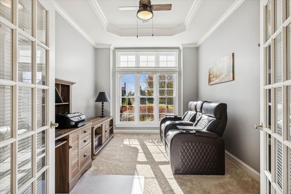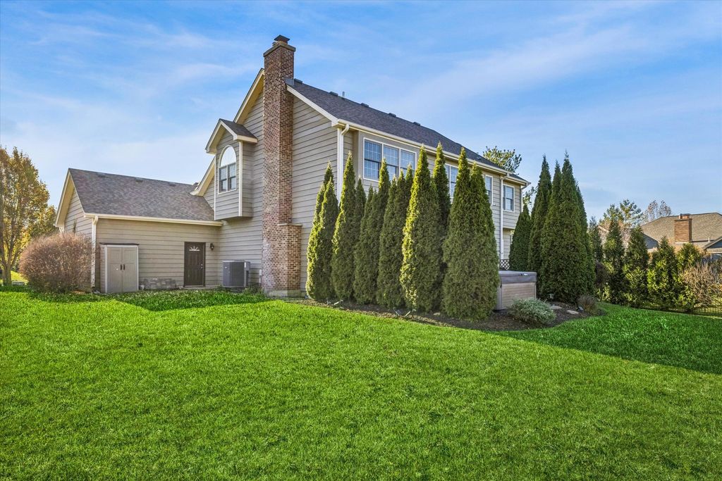 Pride of ownership shines in this beautifully maintained home by the original owners in Terrace Lakes, Algonquin. This highly sought-after Oakhurst model offers an open, inviting floor plan with gleaming hardwood floors, vaulted ceilings, and a spacious island kitchen featuring updated stainless appliances. The adjoining family room with a cozy gas brick fireplace creates the perfect space for gatherings and relaxation. Enjoy brand-new carpet throughout, fresh paint, and elegant touches including crown molding and tray ceilings. The main floor also features a private office, ideal for remote work or study. Upstairs, you'll find four generous bedrooms, 2 with vaulted ceilings and 3 with ceiling fans. The primary suite is a true retreat with a vaulted ceiling, custom walk-in closet with built-in organizers, and a luxuriously updated bath, whirlpool tub, separate shower, showcasing quartz countertops, dual raised vanities, and stylish modern fixtures. The full basement offers high ceilings and a rough-in bath-ready for your finishing ideas or ample storage. Step outside to a beautifully landscaped backyard with a paver patio, providing a private and peaceful outdoor escape. Additional updates include a newer roof, freshly painted siding, and meticulously maintained mechanicals. Conveniently located just a few blocks from District 158 Huntley Schools, this home truly has it all-style, space, and pride of ownership.