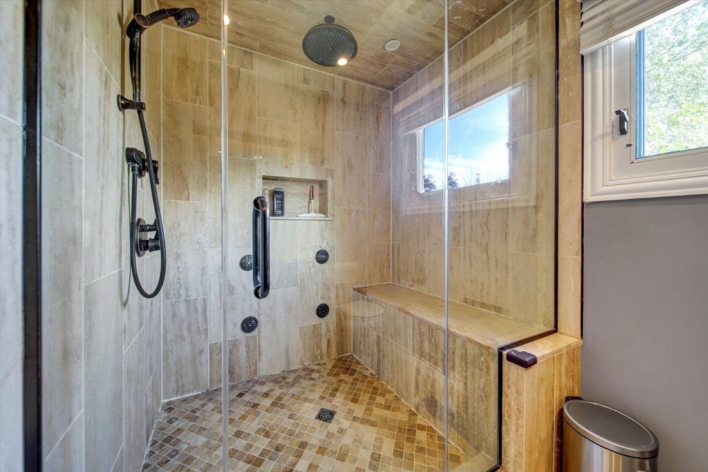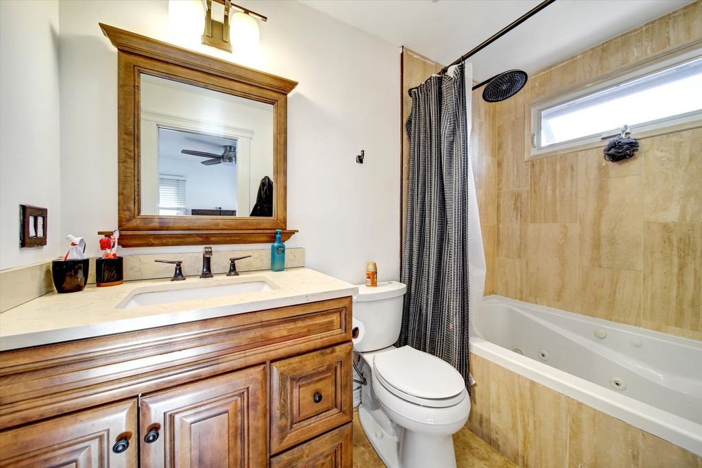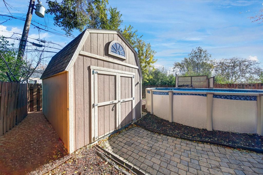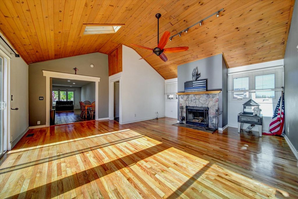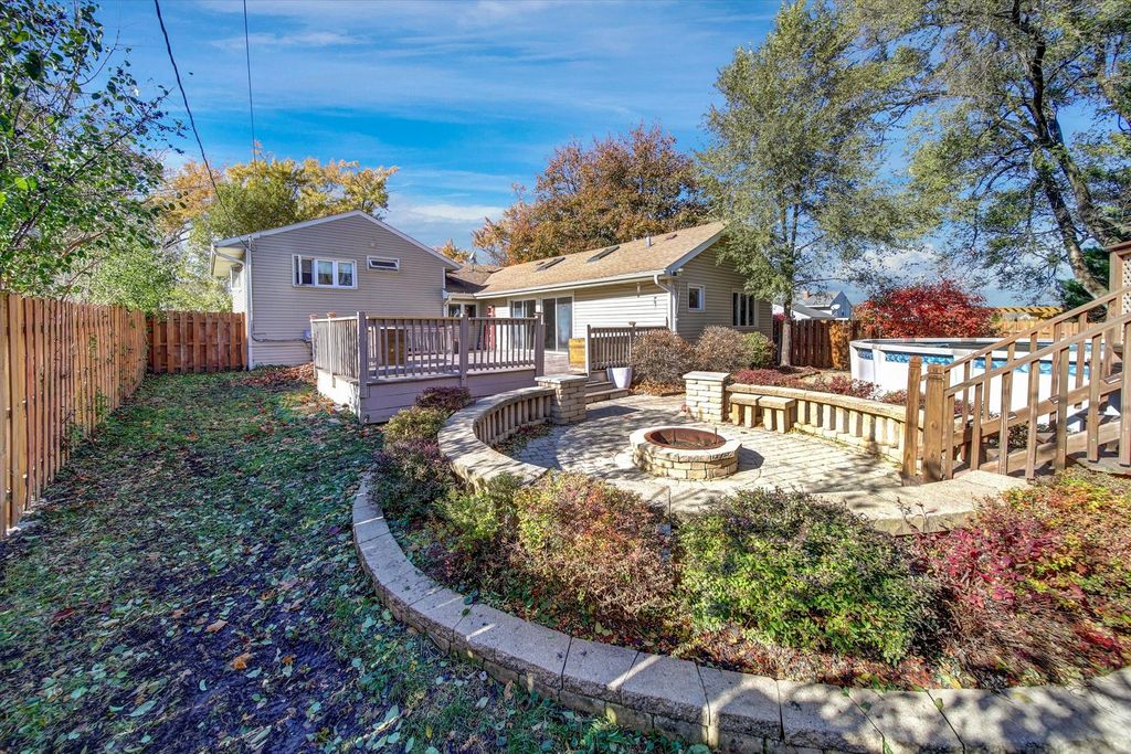 Beautiful move-in ready home offering the perfect blend of luxury, comfort, and modern updates, including Bose speakers throughout. The stunning family room features a wood-paneled cathedral ceiling, skylights, and a striking fireplace-an ideal space for relaxing or entertaining. The main level includes a desirable bedroom with walk-in closet and a stylishly updated full bath. The kitchen impresses with custom cherry cabinetry, granite countertops, stainless appliances, and travertine finishes. Both bathrooms feature travertine tile and quartz, with a soothing whirlpool tub upstairs. Step outside to your fully fenced, private backyard retreat with a spacious deck, paver patio, fire pit, planter boxes, and a custom cedar pool deck with pool. New washer, dryer, and refrigerator included, plus a large storage shed for added convenience