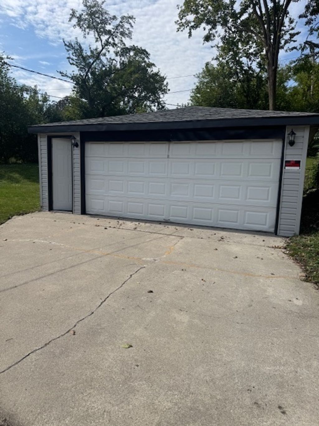 Beautifully Remodeled Ranch featuring a side drive and detached 2-car garage. Exterior painted in modern black with new vinyl siding, fascia, and soffits. Interior offers a bright kitchen with white cabinets, quartz countertops, and stainless steel appliances. Freshly painted gray walls with white trim and laminate flooring throughout. Updated full bathroom with modern finishes. Mechanical room includes washer and dryer. Recent improvements: new roof, furnace, central air, hot water tank, vinyl siding, fascia, soffit, and white thermopane windows. Spacious backyard with large concrete patio, ideal for entertaining. Move-in ready-schedule your showing today!