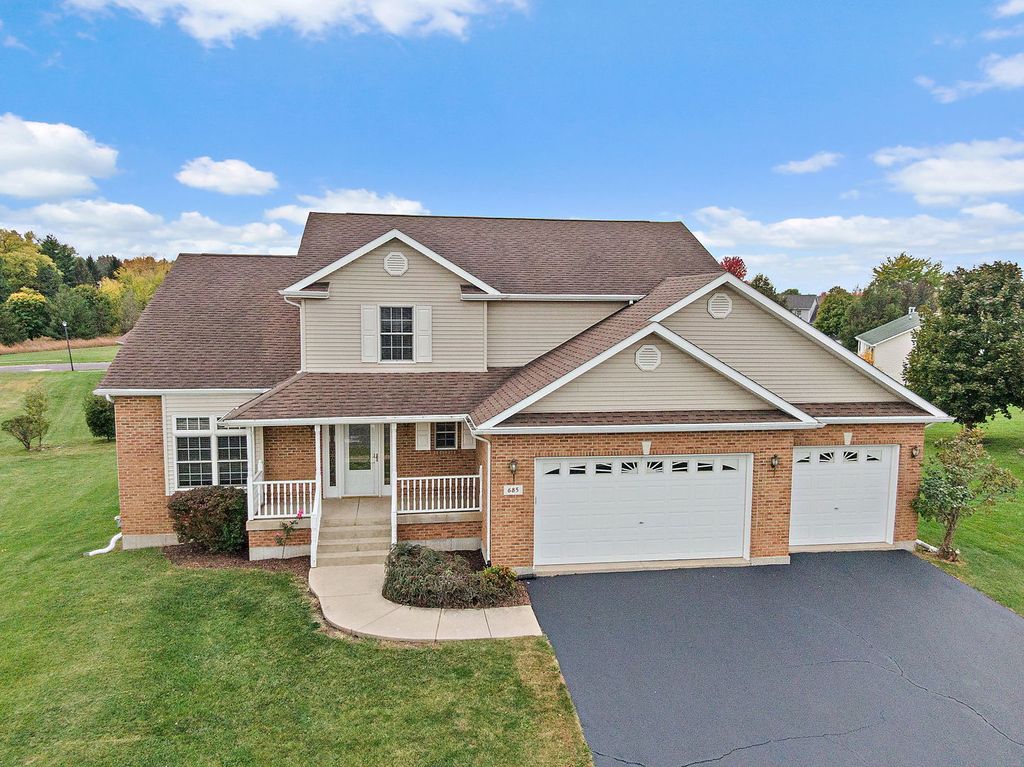 Spacious Living in The Knolls Subdivision. Welcome to this beautiful 3-bedroom, 2.1-bath home offering an impressive 2,670 square feet of living space in the desirable Knolls neighborhood. Perfect time to be in before Christmas! From the moment you step onto the charming front porch and into the expansive foyer, you'll feel right at home. The main level features hardwood floors and abundant natural light. The formal living room boasts soaring ceilings and a unique loft overlook, creating an airy, open feel. Adjacent is the elegant dining room with serene views of the backyard - perfect for hosting gatherings. The fully equipped kitchen is a chef's delight, complete with an island, built-in desk ideal for a coffee bar, and a cozy eating area with direct access to the oversized deck. The inviting family room, anchored by a gas fireplace, is the perfect spot to unwind for movie nights or quiet evenings. A convenient first-floor laundry room sits near the spacious THREE-CAR HEATED garage and a well-placed half bath. Upstairs, a generous loft overlooks both the living room and backyard-ideal for a home office, playroom, or easily convertible into a fourth bedroom. Bedrooms two and three are well-sized with lovely views, and the hall bath offers ample space for family or guests. The oversized primary suite is a true retreat, featuring vaulted ceilings, tranquil backyard views, a large walk-in closet, and a luxurious ensuite with double vanity, jetted tub, and walk-in shower. The unfinished English basement offers 9-foot ceilings, roughed-in plumbing, and endless potential for additional living space, a home gym, or entertainment area. Out back, the expansive yard is perfect for children and pets alike. While the deck and brick paver patio could use a refresh, they offer a canvas for your outdoor dreams. A 14-month home warranty is included for added peace of mind. Conveniently located near tollway access, grocery stores, parks, bike paths, and NIU, this home is ideal for growing families, multi-generational living, or anyone seeking room to roam. With space, comfort, and potential, this is the one you've been waiting for.