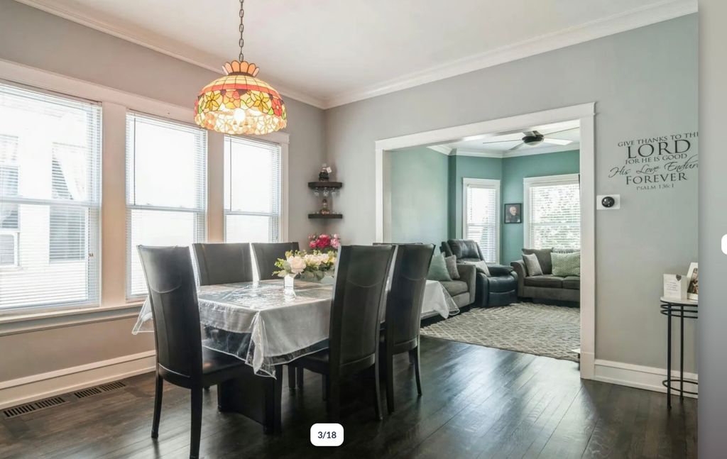 This meticulously maintained 1.5-story home features a bright and inviting living room, a formal dining room, and an eat-in kitchen with a charming vintage walk-in pantry. The enclosed back porch offers a serene view of a small deck, perennial garden, and beautifully landscaped yard and access to the large covered garage. The second-floor attic presents an opportunity for expansion or serves as ideal extra storage space. The finished, dry basement includes a recreation room, laundry, workshop, full bath, bar, and exterior access, making it perfect for extended family living. With updated bathroom, this home is in mint condition-truly a pleasure to show and move-in ready.