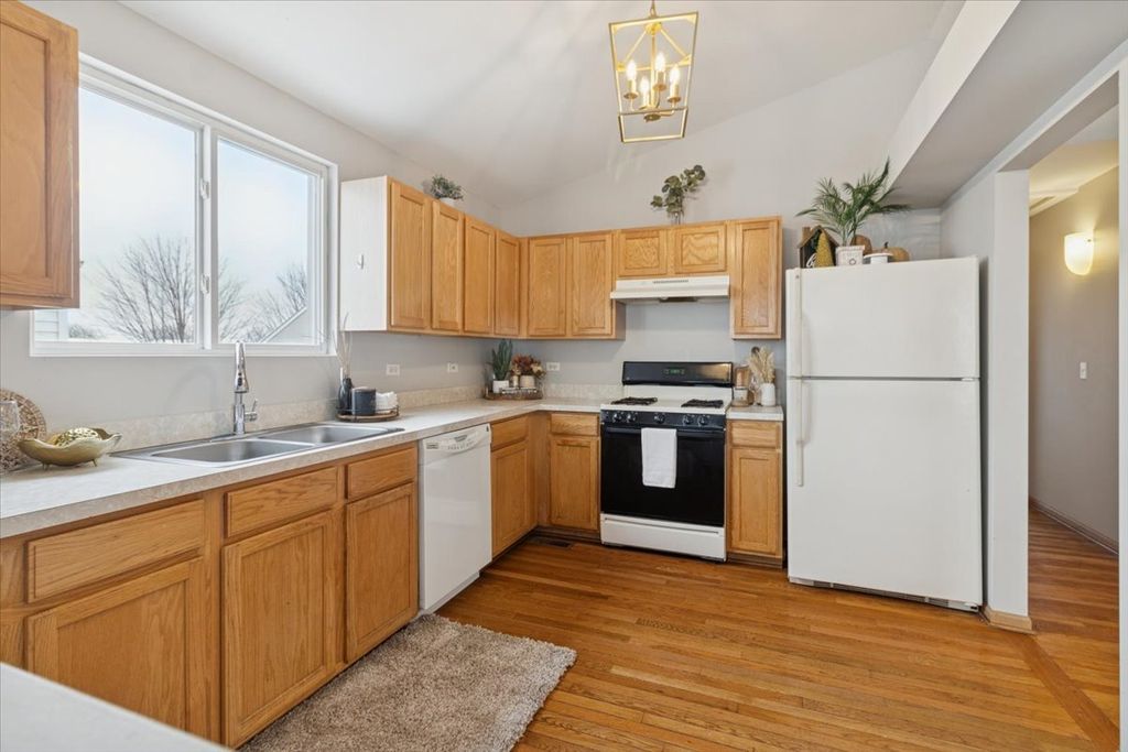 Discover the warmth of this charming 2-bedroom, 2-bath home offering 1,380 sq. ft. of bright, welcoming space in the friendly Hometown community, just steps from a park, daycare, and grocery store. New light fixtures in the dining area and kitchen create an inviting glow throughout the heart of the home, while the vaulted-ceiling living room and hardwood floors add comfort and charm. A spacious downstairs family room with its own full bath can easily become a third bedroom or cozy guest suite. With a sunny south-facing primary bedroom, convenient first-floor laundry, a 2-car garage, and an HOA that covers water, exterior maintenance, lawn care, and snow removal, this home offers easy, stress-free living-and the seller is highly motivated and warmly welcoming all offers.
