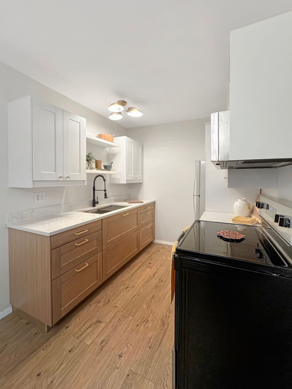 Brand NEW Kitchen with lovely brass/gold hardware, high end quartz countertops, beautiful large stainless steel sink with accessories, new arched black kitchen faucet with sprayer, undercounter trash and recyclable rollout bins, brand new slim line microwave, and stove. Updated bathroom Including painted Bead board, new white oak vanity with quartz top and mirror, new hardware, professionally refurbished cast iron tub and shower tile, and mod tile flooring. Large bathroom closet area for linens, towels and laundry baskets. Further, new updated light fixtures throughout unit, brand new high end carpeting and luxury vinyl wood look flooring. Entire condo freshly painted. Living room has a special feature slat wall design with included television. Also new entryway sliding doors. A great deal of money and labor spent to update this unit. Something to be proud of! One block from FHN hospital and clinic. Hidden little gem! Only Pay Dues (Includes Heat, Landscaping, Snow Removal, Building Maintenance + Parking Spot 12) & a Light Electric bill. Efficient Utilities, Laundry Room and Softened Water Included.