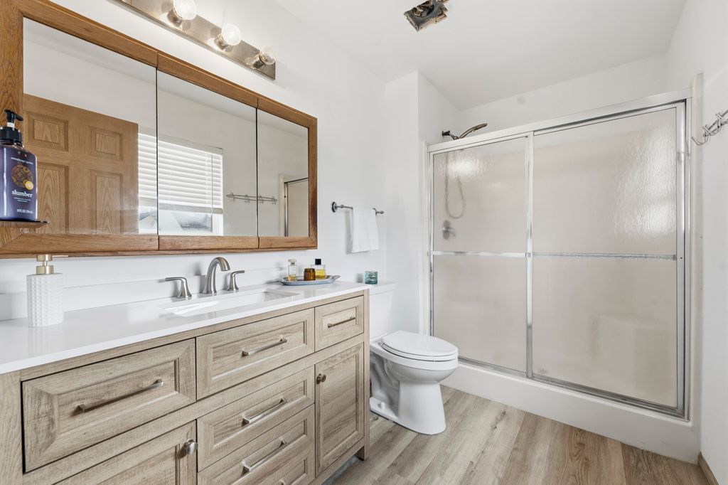 Spacious split-level home offering four levels of living space! The main level features vaulted ceilings and hardwood floors, creating a bright and open feel. Upstairs you'll find generously sized bedrooms, while the lower-level family room offers a cozy fireplace. An additional finished basement provides flexible space for recreation, work, or storage. Enjoy a fully fenced yard, perfect for entertaining or pets. Home is being conveyed as-is, offering a great opportunity for buyers to make it their own.