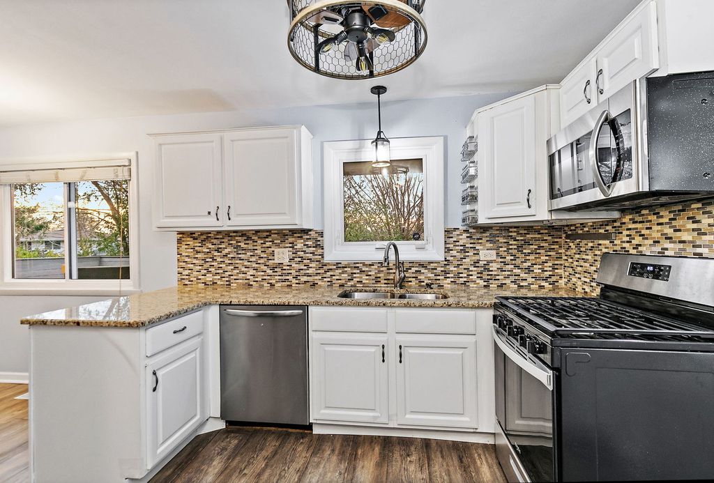 Charming 4 bedroom, 2.1 bath energy efficient home in Schaumburg. Enter into roomy foyer with wood laminate floors, a beautiful crystal chandelier and large entry closet. Living room, dining room combination is spacious with recessed lighting, a bay window and newer carpeting. Eat-in kitchen is updated with granite counters, wood laminate floors, white wood cabinets, newer light fixtures and all stainless steel appliances. Comfortable family room has brick fireplace with gas starter and logs and sliding door to back deck. Laundry is conveniently located off eating area with ceramic floors, utility sink, stylish sliding barn door and access to 2 car garage with workbench and storage shelving. Half bath with natural stone vanity is located in entry hall. Upstairs, master bedroom is spacious with full bath boasting of tile floors, Corian vanity top and walk in shower. Down the hall are three more bedrooms and a full bath with tile floors, bathtub and newer light fixture. Outside enjoy the fenced yard and large private deck! Home has been well maintained with updated kitchen, newer furnace/air conditioning (2025), oven (2020), roof (2016) and more! Located close to dining, shopping, transportation.