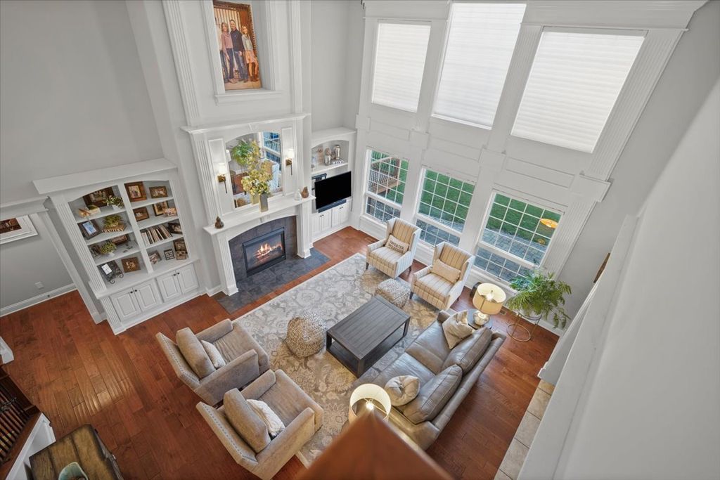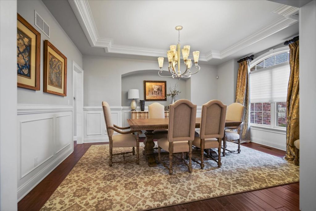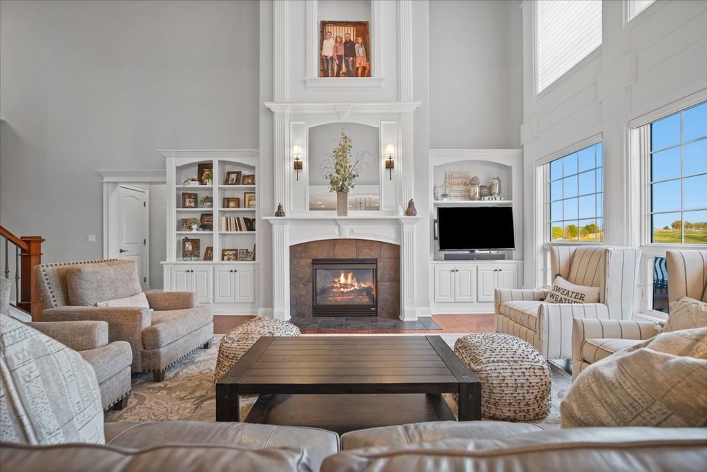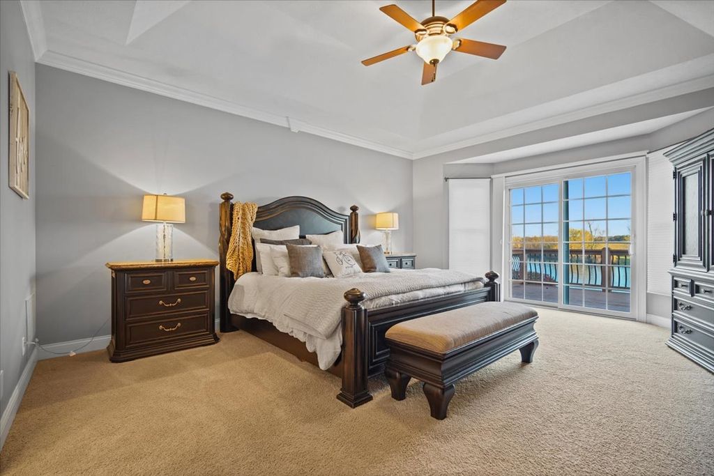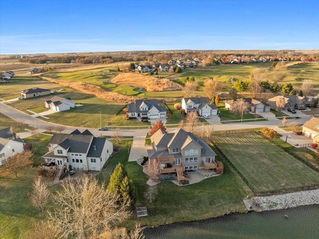 Welcome to one of only two homes positioned directly on the water with sweeping views The Den Golf Course-an incredibly rare combination of privacy, scenery, and luxury living. This stunning 5 bedroom, 4.5 bathroom home offers a highly desirable layout with a first-floor primary suite featuring its own private balcony overlooking the peaceful pond and tee box of 17. The main floor is designed to impress from the moment you enter, with floor-to-ceiling windows in the great room that frame the water, a large eat-in kitchen with a spacious island and granite countertops, a formal dining room, an office with French doors, and a custom built-in drop-zone locker system next to the first-floor laundry room with additional storage. Upstairs, you'll find one bedroom with a private ensuite bathroom and two additional bedrooms connected by a Jack-and-Jill bathroom-an ideal setup for family or guests. The finished basement offers even more space to unwind and entertain, featuring a full theater room, a wet bar, daylight windows, an additional family room, bedroom, another full bathroom, and a storage area which is currently being used as a workout space. The backyard is truly unmatched with no neighbors behind you, just tranquil water, a paver patio, a large deck, and wide-open golf course views. Additional features include a 2025 roof, garden beds, garage cabinets, a heated side-load garage, central vac, and an irrigation system. This exceptional home offers an unbeatable setting, thoughtful design, and incredible views in every season.