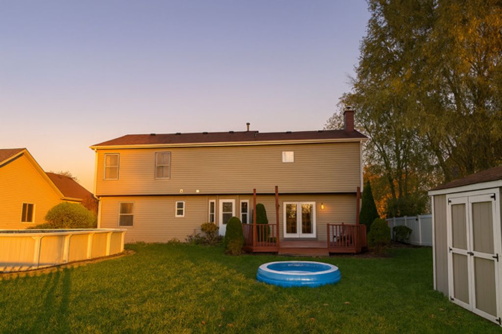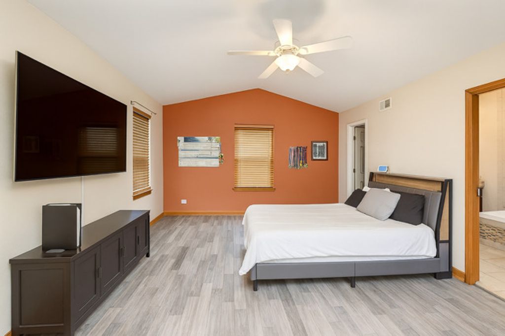 Stunning waterfront sunsets await! This spacious home offers incredible outdoor living with a massive fenced yard, two-tiered deck, and peaceful water views-perfect for entertaining or relaxing. Inside, the cozy family room with a fireplace creates a warm, inviting atmosphere. The eat-in kitchen features stainless steel appliances and a stylish backsplash. The primary suite includes a walk-in closet, cathedral ceiling, dual vanity, Jacuzzi tub, and tile-surround shower. A finished basement provides additional living or recreation space. Located just steps from the park, this home offers both comfort and convenience. Home needs TLC and is priced accordingly. Sold AS-IS. Don't miss this opportunity to customize and add value in a beautiful waterfront setting!