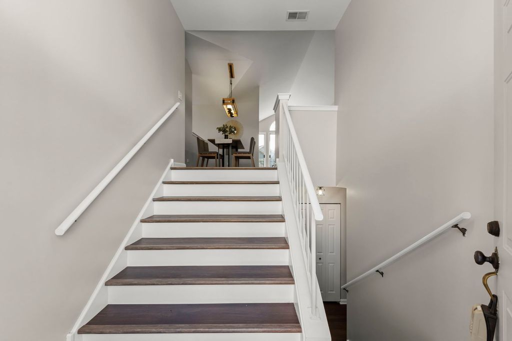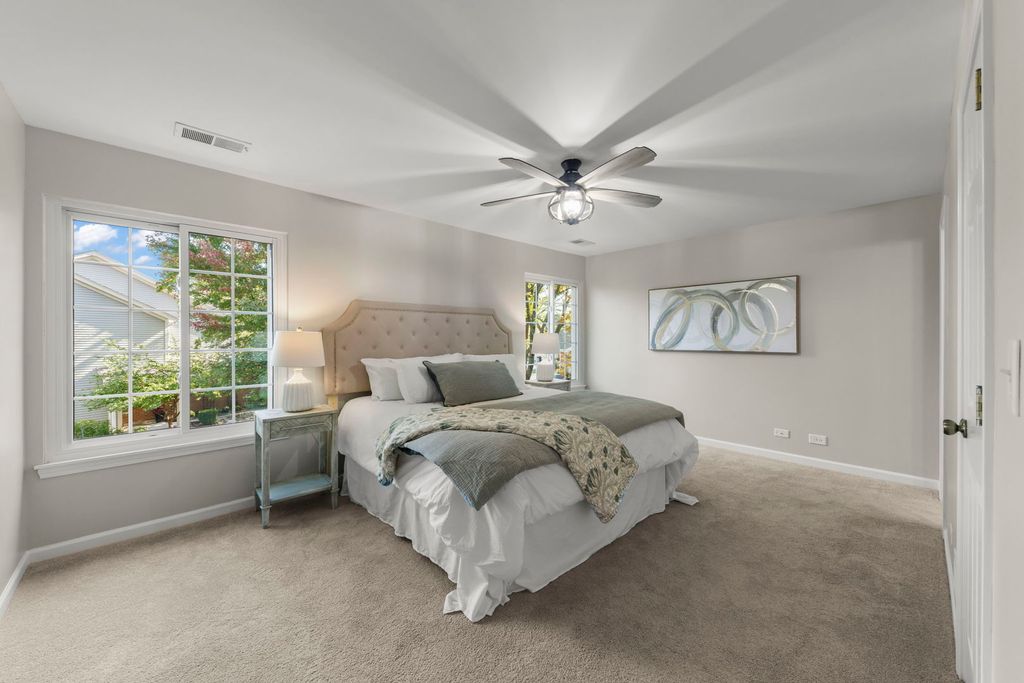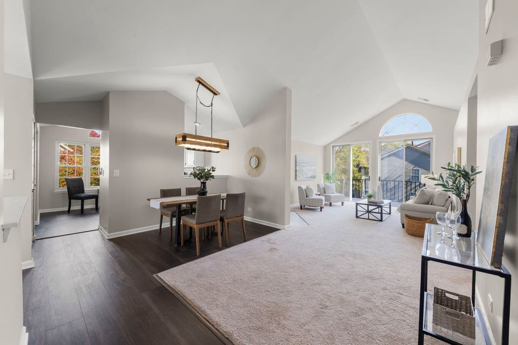Welcome to the desirable Maple Hill Clubhouse Subdivision in Warrenville! This beautifully updated home features an open floor plan with vaulted ceilings, a cozy gas fireplace, and a private deck/balcony perfect for relaxing or watching the sunset. A flexible home office with a private entrance can also serve as a third bedroom. The updated kitchen offers two pantry closets, stainless steel appliances (2017), and plenty of workspace. The primary suite includes a walk-in closet and a remodeled full bath with dual sinks and neutral finishes. A second remodeled full bath features a newer vanity, toilet, and tiled shower connecting to the second bedroom and in unit laundry area with a high efficiency washer and dryer (2017). Additional updates include triple argon vinyl windows (2018), hot water heater and water softener (2017), garbage disposal (2017), fresh paint in the living, dining, and entry areas, new vinyl plank flooring (2025), a remodeled master bath (2017). Enjoy the convenience of an attached two-car garage and community amenities including a clubhouse, pool, and walking paths. Move right in and enjoy comfortable, low-maintenance living in a prime Warrenville location! AC 2016-2017, Furnace original.
