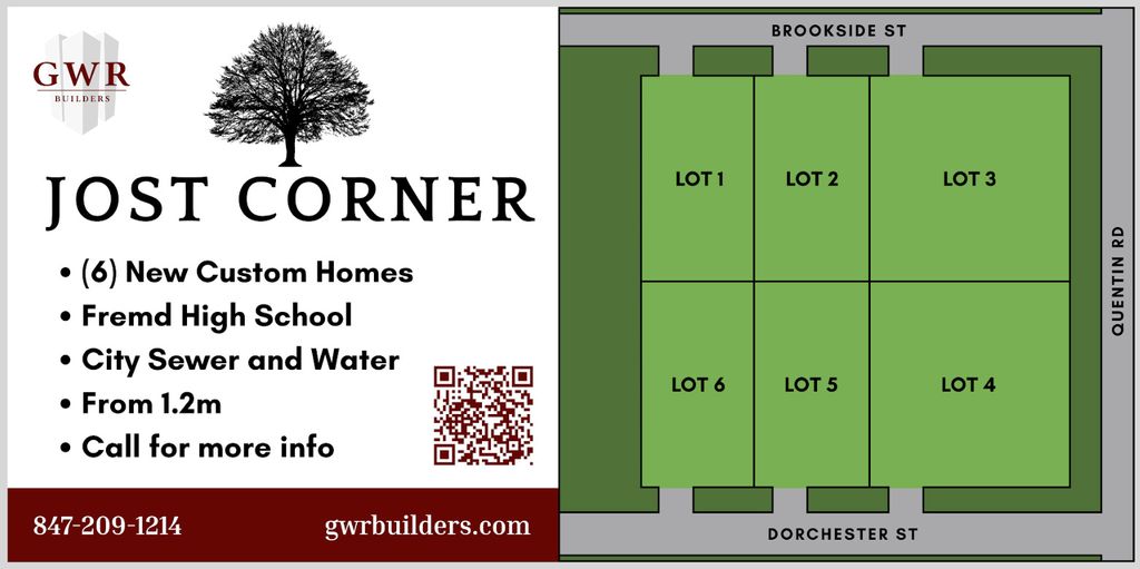 Welcome to Jost Corner, featuring (6) new custom homes within walking distance to FREMD HIGH SCHOOL! This is is a sought after location, and (4) homesites have already been reserved. This listing features a 3600sf custom home, one of many house plans available for construction. Homesites vary in size; (4) are 75x135 and (2) are 135x135. (3) homes will face Dorchester Rd., and (3) homes will face Brookside St. Homes to be built will have minimum sq ft requirements. These new homes will be built amongst newer construction in the area. Photos shown are of work done by builders. Construction on new residences will commence early 2026. This is a truly unique opportunity that does not come along often! (Photos are of elevations and interiors built by and available from builder).