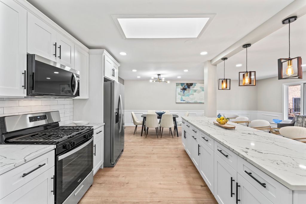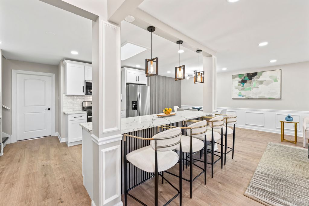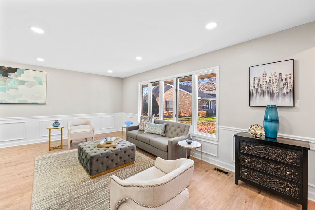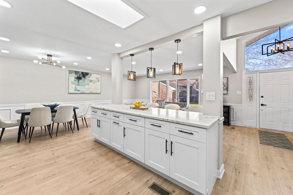 This BREATHTAKING and fully renovated tri-level townhome, nestled on a quiet cul-de-sac in the highly sought-after Eagle Ridge II community, offers the ultimate turn-key experience. Its prime location backs directly onto a serene, large park featuring a scenic walking trail. Every detail has been meticulously upgraded, starting with the installation of gorgeous new flooring throughout all levels and a fresh coat of paint. A crucial element of this top-to-bottom renovation includes all new trim and all new interior doors, upgraded to the modern 2-panel style, providing a clean, contemporary look throughout the entire residence. The open-concept layout highlights the HUGE and stunning new kitchen, designed for both luxury and utility, featuring amazing new white cabinets, a sophisticated white quartz countertop, and elegant tile backsplash, all complemented by a brand new stainless steel appliance package. The kitchen's centerpiece is a massive 113-inch center island with a counter overhang, making it the perfect breakfast bar. Beyond the custom millwork, which includes elegant wainscoting and chair rail, the dining room boasts a stylish accent wall, adding depth and character to the space, and the living area features a very nice and cozy fireplace, perfect for cool evenings. The staircase has been modernized with new rail spindles. The entire electrical system has been modernized with new can lighting, designer light fixtures, and even new electric outlets and switches. The home features three spacious bedrooms, including a luxurious master suite, and two and a half completely brand new, custom-finished bathrooms, plus the added convenience of a laundry closet with a utility sink. For entertainment, the lower level boasts a newly installed wet bar. Storage is plentiful, with generous closet space throughout and the convenience of pull-down stairs in the 2.5-car attached garage for easy attic access. Enjoy low-maintenance living and an unbeatable location just minutes from shopping, dining, the Metra station, and easy access to the interstate. This is a complete, amazing transformation offering true luxury living in the suburbs.