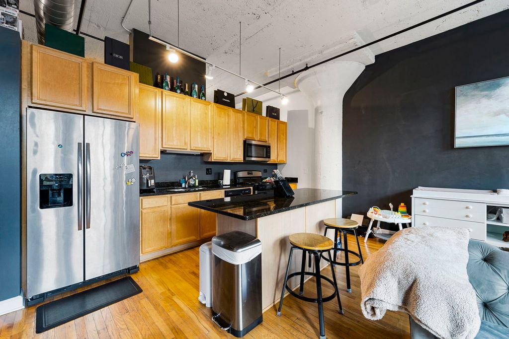 Experience true South Loop living in this spacious 947 sq ft 1-bedroom loft inside the historic Prairie District Loft Building, a beautifully converted former industrial structure known for its character, history, and striking architectural details. This oversized home features 12-foot concrete ceilings, exposed brick walls, hardwood floors, and large windows that bring in great natural light. The open kitchen offers maple cabinetry, granite countertops, a generous island, and stainless steel appliances. The living space flows seamlessly onto a private balcony. The expansive bathroom includes a double-bowl vanity, a separate glass-enclosed shower, and a deep soaking tub. Building amenities include a fitness room, bike storage, a storage locker, secure entry, and on-site management. Indoor parking available for $25,000 (space #113). Perfectly located in the quiet, historic Prairie Avenue District, you're moments from the lakefront, Museum Campus, Soldier Field, Northerly Island, 18th Street Bridge beach access, Chicago Women's Park, top South Loop restaurants, coffee shops, gyms, and the CTA. A rare blend of history, style, and convenience.