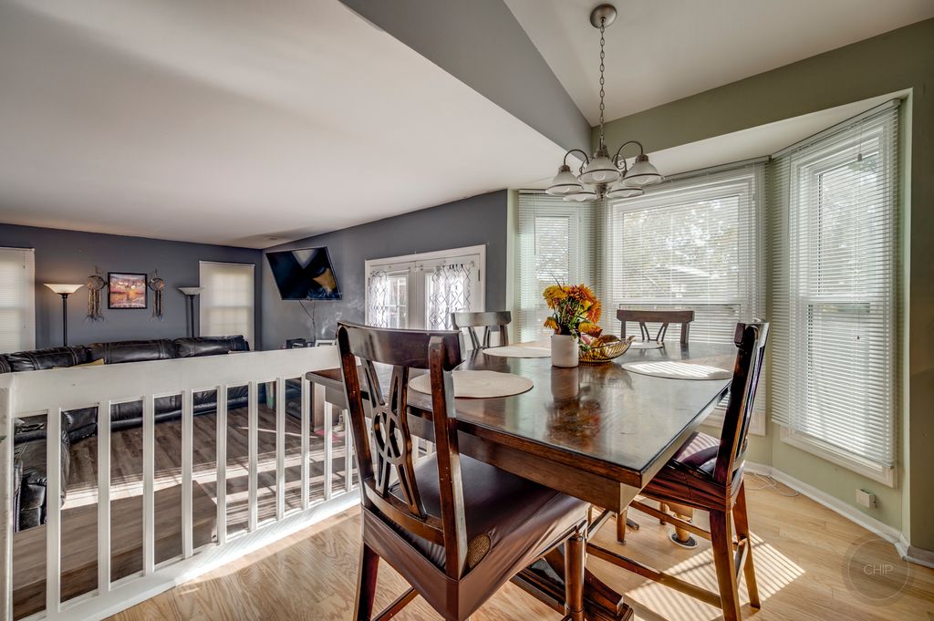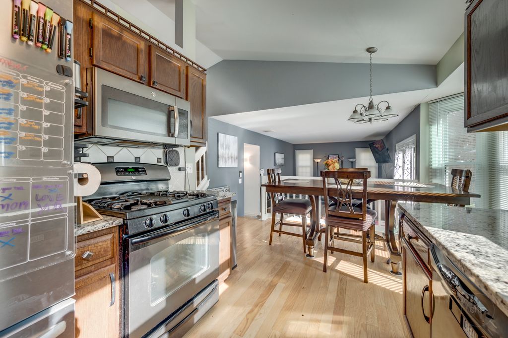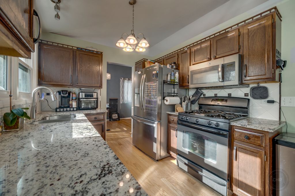 BEAUTIFUL HOME IN POPULAR BROOKWOOD ESTATES! Nicely maintained home perfectly located on quiet street. Upon entry you will find soaring vaulted ceilings over the large living room featuring hard wood flooring and updated light fixtures. Newer windows allow tons of natural light. Updated kitchen offers newer stainless steel appliances, granite counter tops and tiled backsplash as well as updated laminate flooring. Eat-in kitchen overlooks the spacious living room with updated laminate flooring and NEW double french doors leading out to the private custom brick paver patio. If you need more space, you can enjoy the finished basement! Home also has a main floor laundry room! Upstairs are three spacious bedrooms. Master bedroom has double doors, vaulted ceiling, skylights, walk-in closet and updated master bathroom. Home has newer furnace and AC as well as newer siding and windows. Roof 2022, NEW driveway 2023, NEW water heater 2023, NEW refrigerator 2023. Close to shopping and expressways!