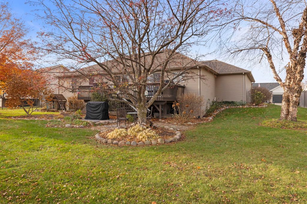 Welcome home to 1120 Oxford Circle, where easy ranch living meets peaceful pond views in one of Sycamore's most loved neighborhoods. From the moment you step inside, this home just feels right. Sunlight fills the open-concept living space, where the kitchen, dining area, and living room flow together effortlessly-perfect for everyday life, game days, and gatherings with family and friends. Vaulted ceilings and a cozy corner gas fireplace make the living room a natural place to relax and unwind. The kitchen is both beautiful and functional, featuring white cabinetry, stainless steel appliances, a center island, and striking matte granite countertops-whether you're cooking a quiet weeknight dinner or hosting a crowd. Working from home is a breeze in the elegant office with French glass doors, offering privacy without feeling closed off. Rich hardwood floors run through the main living areas, adding warmth and character throughout. The primary suite is a true retreat, with a walk-in closet and spa-like bathroom complete with a corner whirlpool tub, double sinks, and a separate shower. Built-in bookcases lead you to two additional main-level bedrooms and a full hall bath-perfect for guests, kids, or flexible living. Downstairs, the finished lookout basement expands your living space with a large family room, two more bedrooms, a half bath, and stylish wood-laminate flooring. There's also a generous storage room with shelving plus a dedicated workshop area-space you'll truly appreciate. Step outside to your private deck overlooking a serene pond, where mornings are quiet, evenings are peaceful, and the fenced yard gives you both beauty and privacy. A 2.5-car garage provides plenty of room for vehicles, tools, and storage. This move-in-ready home blends comfort, space, and scenery in all the right ways. If you've been waiting for a place that feels welcoming, functional, and special-this is it. Come see what life at 1120 Oxford Circle is all about.