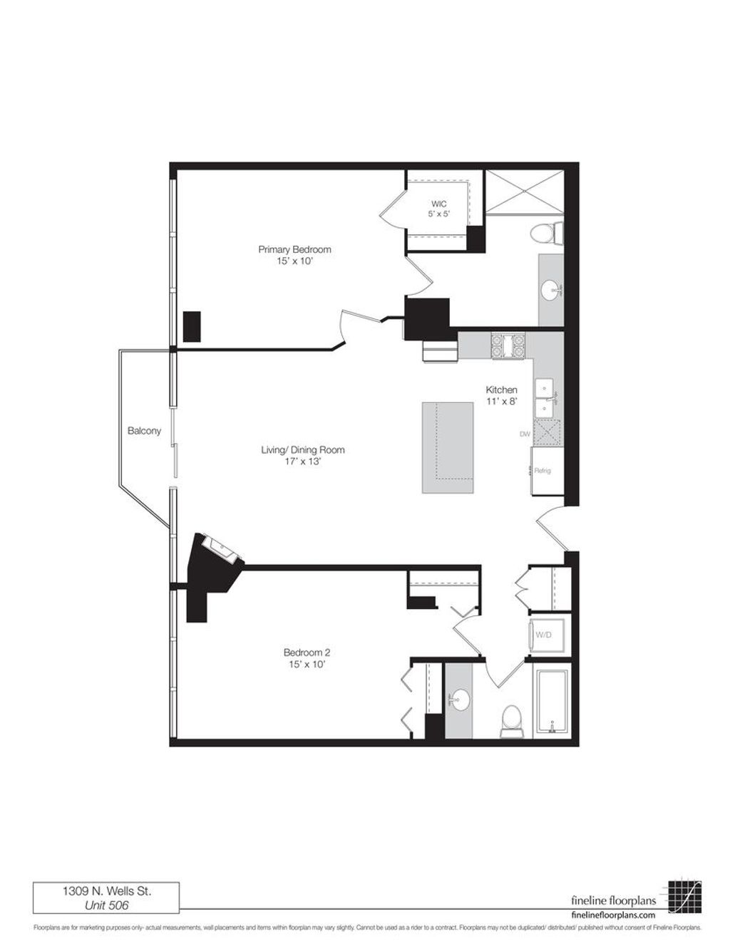 Bright and open south-facing 2 bed / 2 bath condo with 1 garage parking space, private balcony, and in-unit laundry in the heart of Old Town! Large bedroom sizes, with primary bedroom en suite and lots of closet space throughout! Recently replaced central air A/C system and washer/dryer. This elevator building features door staff, remodeled hallways, a community room, and a common rooftop with skyline views. RCN internet and cable, storage cage, and garage parking are included in the assessment. Rare 99 "Walk Score"! Incredible location close to all the restaurants and shops on Wells Street, the 3 Arts Club Cafe, CTA Red and Brown Lines, Jewel-Osco, and Aldi!