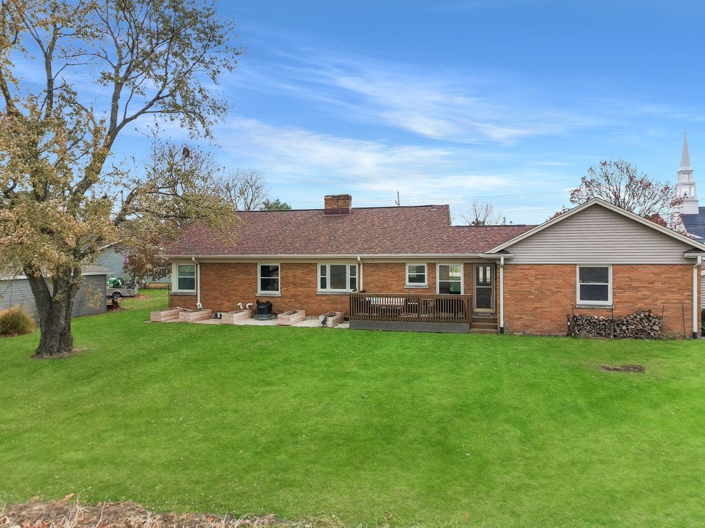 Say hello to this all-brick Ranch that's serving up full-on countryside glam. Surrounded by rolling fields that stretch for miles, this beauty gives you front-row seats to nature's daily light show that is best enjoyed sipping something fabulous on the deck, pretending you're in a country music video (no singing talent required). Inside, the Living Room is basically a hug in house form. Newer whisper-soft carpet? Check. Wood-burning fireplace? Check. Plantation blinds and recessed lighting that make you look suspiciously well-rested? Double check. The Kitchen is where the real bragging rights begin. A distressed cabinet finish that says "I woke up like this," quartz countertops smooth as silk, glass tile backsplash, under-cabinet glow-up lighting, a pantry, and a built-in so useful it deserves a tiny trophy. The Primary Bedroom? Oh, it's giving boutique-hotel energy-hardwood floors, his-and-her closets with their own automated lighting (so you can finally tell black from navy), and a built-in dresser that basically whispers,"I've got you." Bedroom 2 rocks hardwood floors and a "so-deep-it's-suspicious" closet and is currently pulling nursery duty. Bedroom 3 adds drama with its walk-through option. Guest Room? Office? Secret Hideout? Dealer's choice. The main Bathroom has been freshly updated from top to bottom, sparkling like it's waiting for its HGTV close-up. And then, wait for it, the finished lower level! A whole second universe with: a SECOND Kitchen (yes, you read that right), a Rec Room with brand-new, paparazzi-ready LED lighting, a dry bar for your Friday fun, a second fireplace (pending a little TLC before it roars), a second bathroom-tile already included for its future glow-up. Outside? Newer windows, a roof & gutters only about 2 years old, and a separate shed with an overhead door, currently living its best life as a personal gym escape. An invisible fence is included for your furry little escape artists. Perk: the basement freezer is staying because this house likes to spoil you. This ranch doesn't just check boxes, it flips its hair, throws glitter, and dares you not to love it!