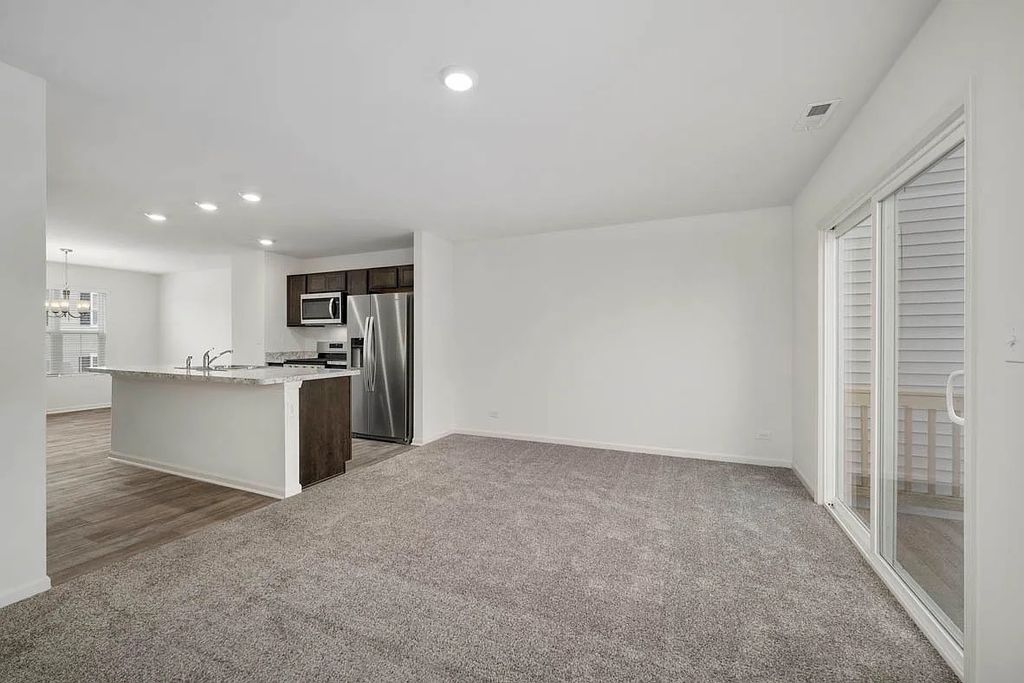 Welcome to better than new! This beautiful 3 bed, 2.5 bath END UNIT townhome in Yorkville's Grande Reserve neighborhood is a fantastic example of move in ready. as you enter the home you are welcomed by a stunning BRIGHT first floor with a large kitchen stacked with stainless steel appliances, LVP floors, and a MASSIVE center island. Just past the eat in kitchen is a large family room with access to your private balcony! upstairs you have the laundry room, a large master bedroom with walk-in closet and private ensuite master bathroom, as well as 2 additional spacious bedrooms and a guest bathroom! thats not all! head to the basement to find your flex space perfect for a 4th bedroom, office, man cave, truly whatever you can imagine! just off the flex space is your spacious 2 car garage. Dont delay, make this your home today! Picture listed of Model unit
