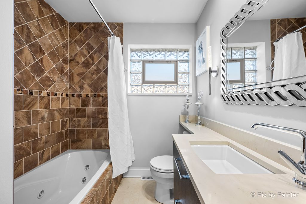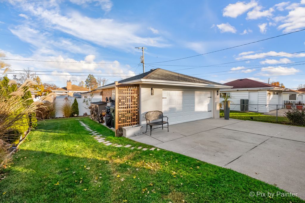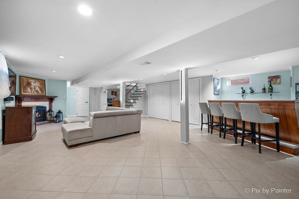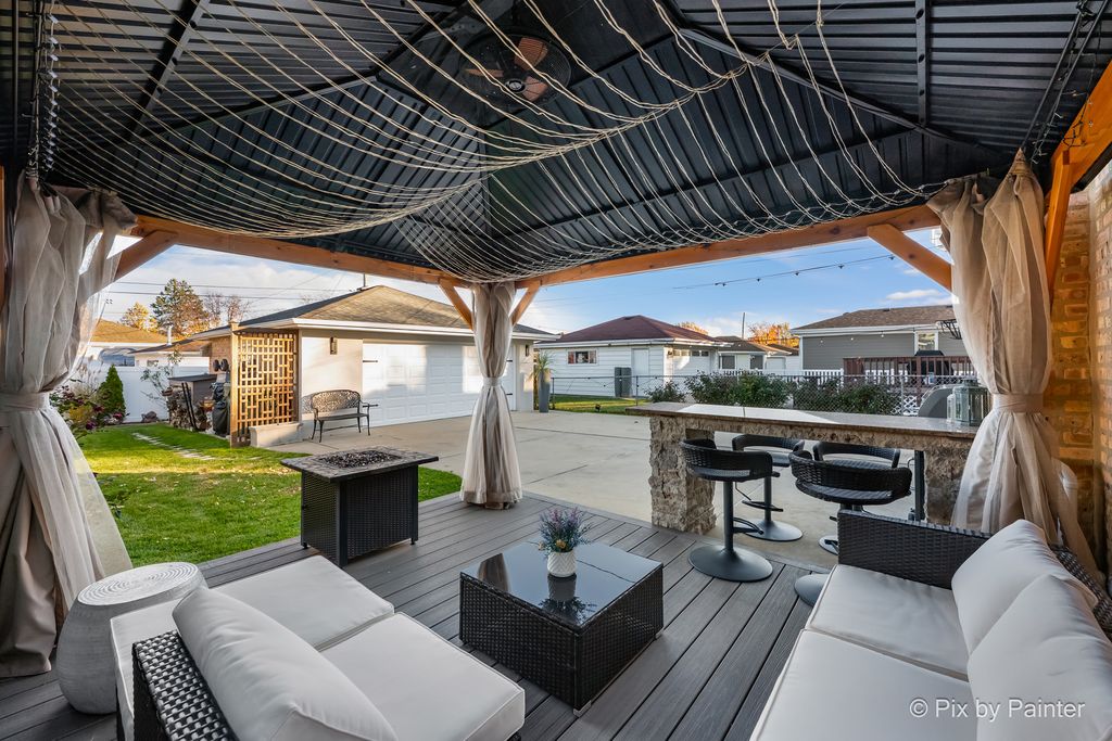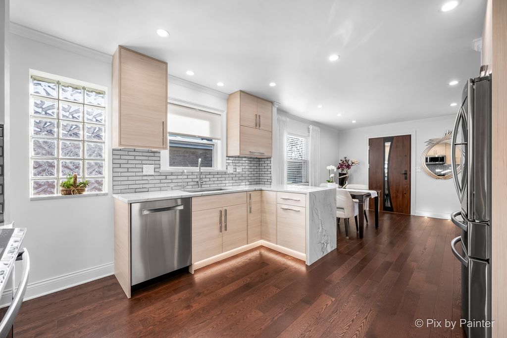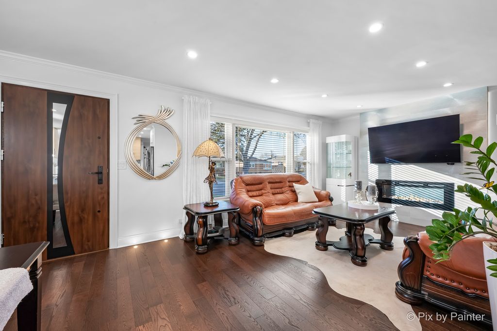 Glamorous luxury home with exceptional attention to detail. Features dark oak hardwood floors, open-concept kitchen with custom cabinetry, quartzite waterfall countertops, glass backsplash, new stainless steel appliances, ThinQ fridge. First-floor bathroom with jacuzzi. Two fireplaces: electric on the first floor and gas in the finished basement with wet bar and summer kitchen. Front doors are custom-made from Europe with premium material for security and modern appeal. Additional upgrades: high-efficiency furnace/A/C, electronic washer, extra-wide driveway. Fenced yard with stone & granite outdoor kitchen and lighted gazebo. Steam shower and whole-house water filtration system. Walk to elementary, Park Ridge High School; low Niles taxes. A truly exceptional home-must see!