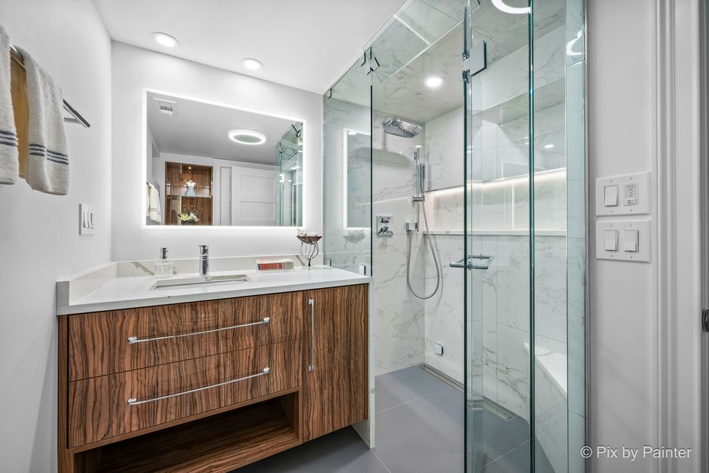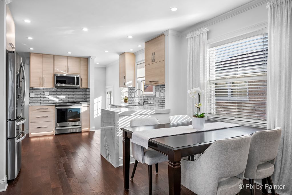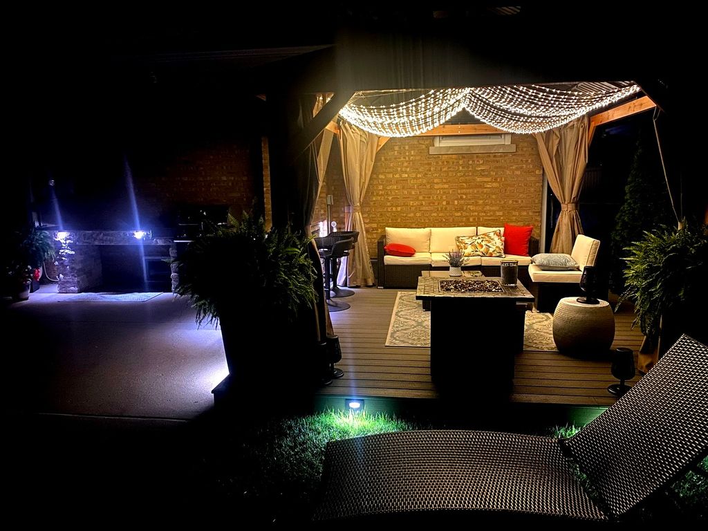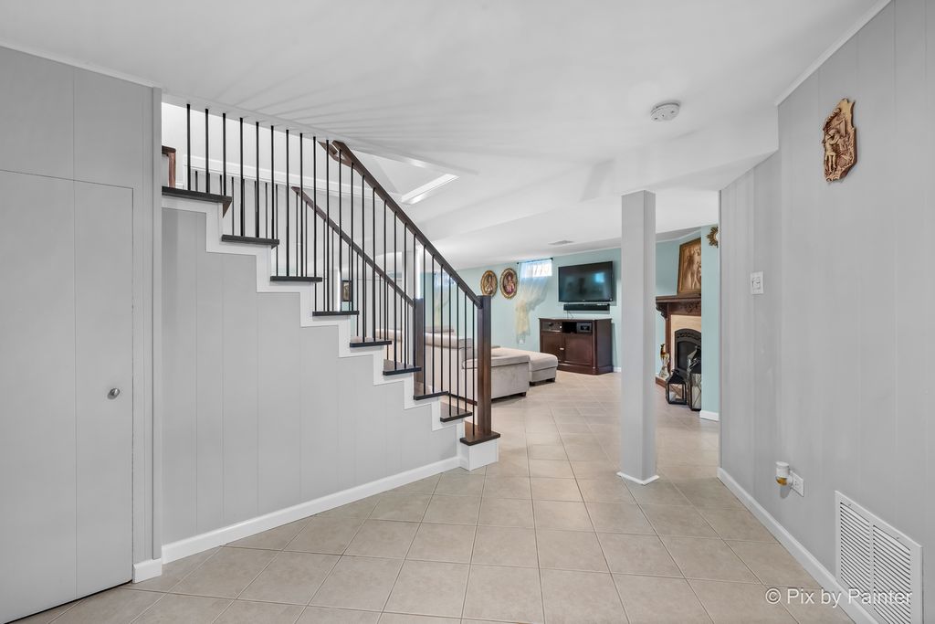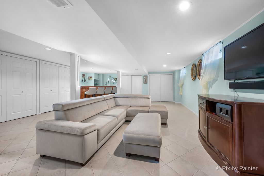 Glamorous luxury home with exceptional attention to detail. Features dark oak hardwood floors, open-concept kitchen with custom cabinetry, quartzite waterfall countertops, glass backsplash, new stainless steel appliances, ThinQ fridge. First-floor bathroom with jacuzzi. Two fireplaces: electric on the first floor and gas in the finished basement with wet bar and summer kitchen. Front doors are custom-made from Europe with premium material for security and modern appeal. Additional upgrades: high-efficiency furnace/A/C, electronic washer, extra-wide driveway. Fenced yard with stone & granite outdoor kitchen and lighted gazebo. Steam shower and whole-house water filtration system. Walk to elementary, Park Ridge High School; low Niles taxes. A truly exceptional home-must see!