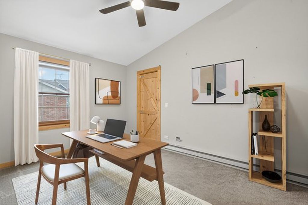 Welcome to this 2 bed, 2 bath second-floor condo in desirable Country Club Manor offering a bright and open layout. The spacious living room features vaulted ceilings, recessed lighting, and ceramic tile flooring throughout. Tucked away near the balcony door is a fold down dining table. The kitchen includes a convenient breakfast bar and direct access to the laundry room, which offers built-in shelving for additional storage. The unique primary suite features a Murphy bed, walk-in closet, and a private en suite with a relaxing soaking tub. A built-in bookshelf cleverly conceals the primary bedroom door, adding a touch of charm and privacy. The secondary bedroom includes a generous closet, and the hall bath offers a walk-in shower. Enjoy a private balcony for morning coffee or quiet evenings outdoors. Additional highlights include ceiling fans in both bedrooms and a detached one-car garage. Ideally located just minutes from downtown Woodstock, the Metra Station, parks, shopping, and dining-this home combines comfort, convenience, and character.