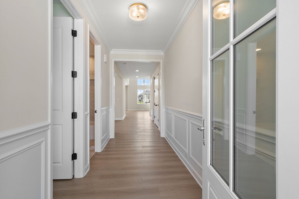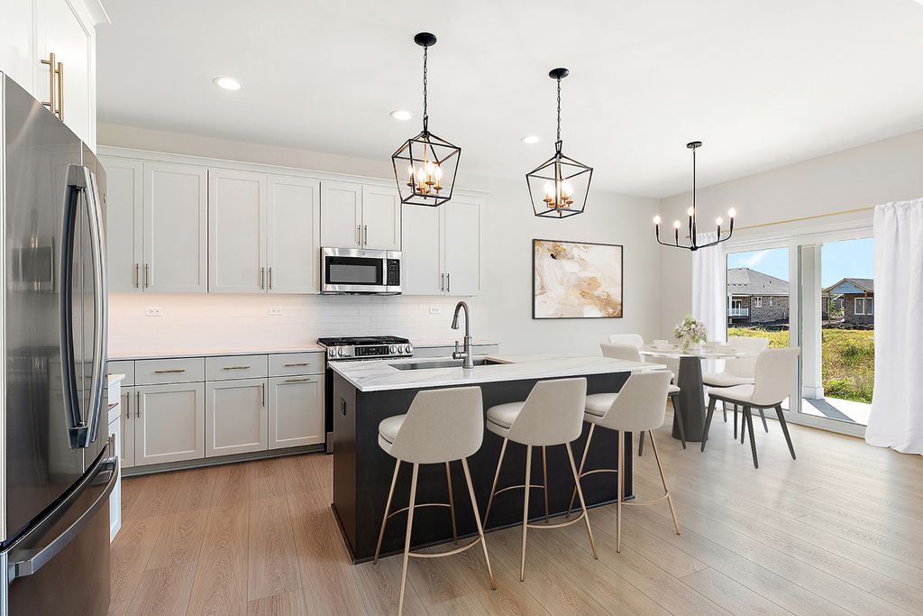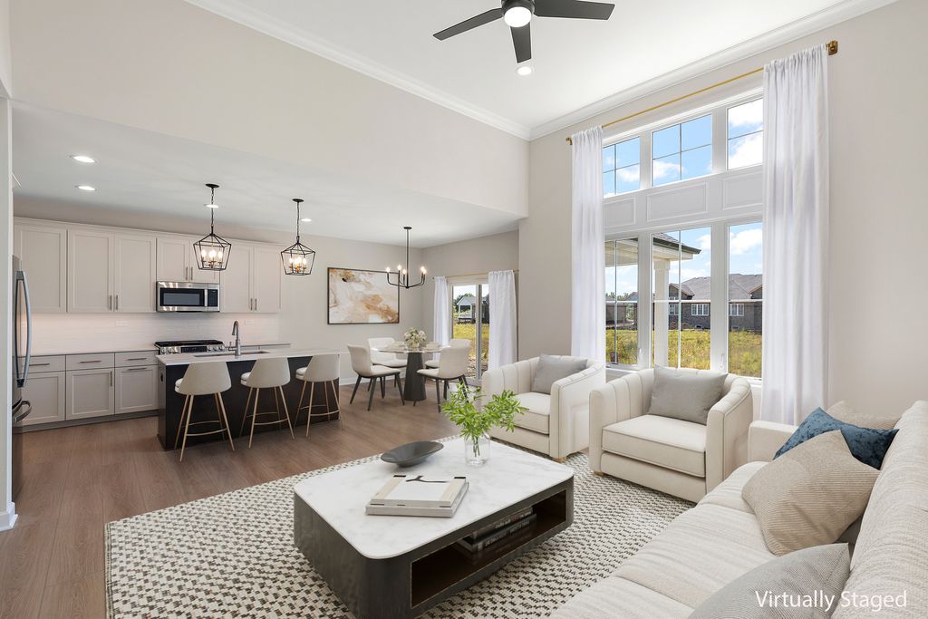 Welcome to your perfect retreat, an exquisite ranch villa nestled in a tranquil setting with picturesque views of a peaceful retention pond. This thoughtfully designed home features a sophisticated exterior, blending classic brick with durable LP SmartSide siding, premium Pella 250 series windows, and a spacious 12 x 12 covered patio ideal for outdoor relaxation. A beautifully designed interior will greet you as you enter through the grand 8' door with a secure 3-point locking system. The kitchen is a true masterpiece, featuring 42" off white cabinets, gleaming quartz countertops, a tiled backsplash, under-cabinet lighting, and a generous walk-in pantry for all your culinary needs. Adjacent to the kitchen, the family room welcomes you with soaring vaulted ceilings and refined crown molding. At the same time, the adaptable layout includes a charming dining room with crown molding and a butler pantry for those special gatherings. The luxurious primary suite is a personal retreat, offering a tray ceiling, comfort-height double vanity, a stunning 6' curbless seated shower, and a large walk-in closet with abundant storage space. Additional highlights include Hallmark vinyl-plank flooring in the main areas, 8' doors, crown molding, and wainscoting throughout the foyer for a grand touch, as well as an open basement staircase with rough-in plumbing ready for customization. Additional features include casing around windows, cased openings, and a laundry sink in the cabinet. Ideally located near shopping and major expressways, this villa offers both elegance and everyday convenience. Different floor plans and locations are available.