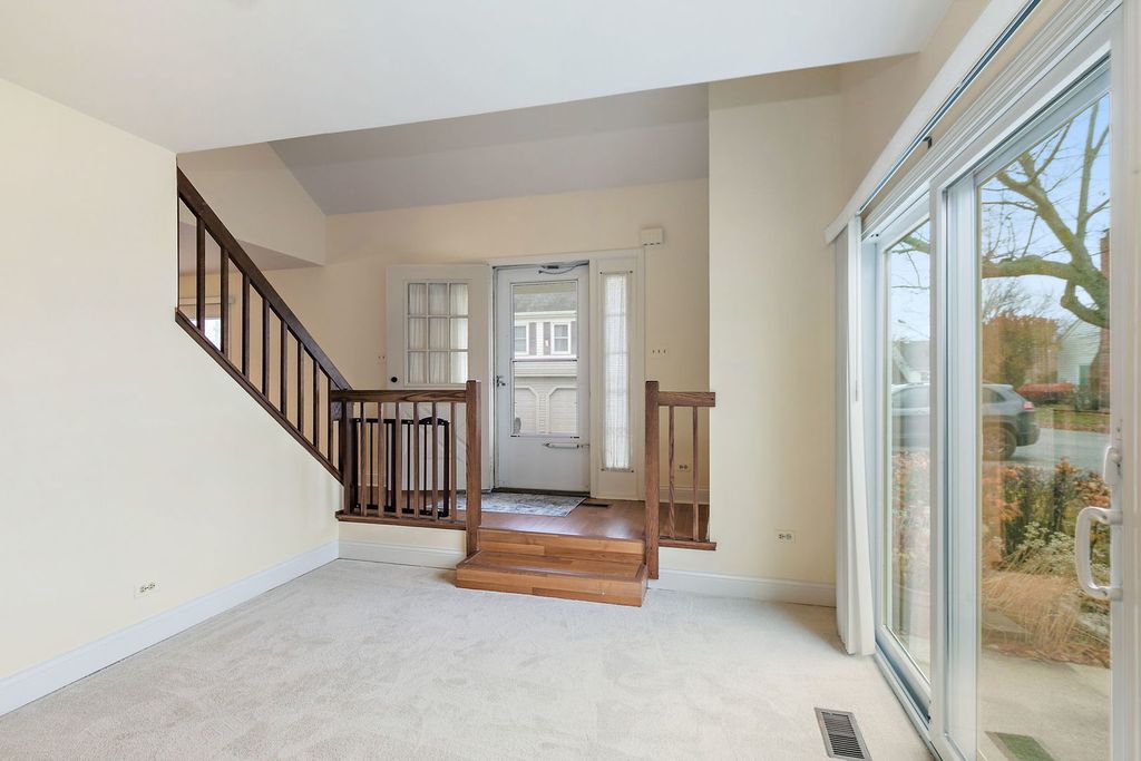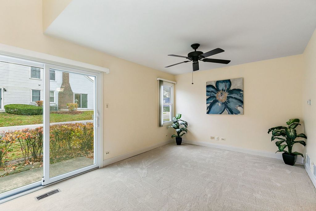 Nicely updated 2 bedroom, 2.5 bath end unit townhome with 2nd floor laundry and an attached garage! Step into the home through a vaulted foyer that opens to the living room, featuring newer carpet and access to a private concrete patio through the sliding glass door. The updated kitchen flows into the dining room and includes granite countertops with a matching backsplash, stainless steel appliances, and a walk-in pantry/storage room for extra convenience. Upstairs, you'll appreciate an ideal layout with two bedrooms - each with its own private full bathroom. The second bedroom is light and bright thanks to the vaulted ceiling with skylight, and the full bath includes a shower currently equipped with a walk-in whirlpool tub with seat and faucet/handheld sprayer. The primary suite offers a walk-in closet, its own full bathroom, and a generously sized bedroom that easily accommodates a sitting area or desk. The home was freshly painted in 2025, furnace/AC replaced in 2019 and windows and flooring around 2015. Storage is plentiful with abundant closets throughout and extra cabinets and shelving in the garage. Fantastic location in Fremd HS district and just minutes from Harper College, Woodfield Mall, restaurants, and more. Come take a look before it's gone!