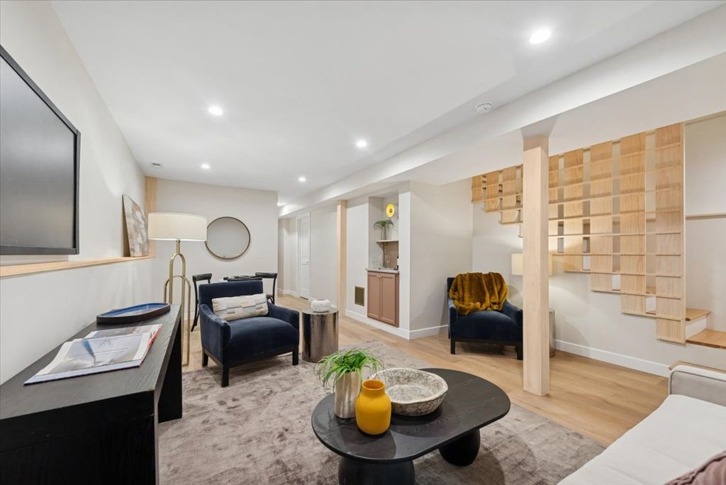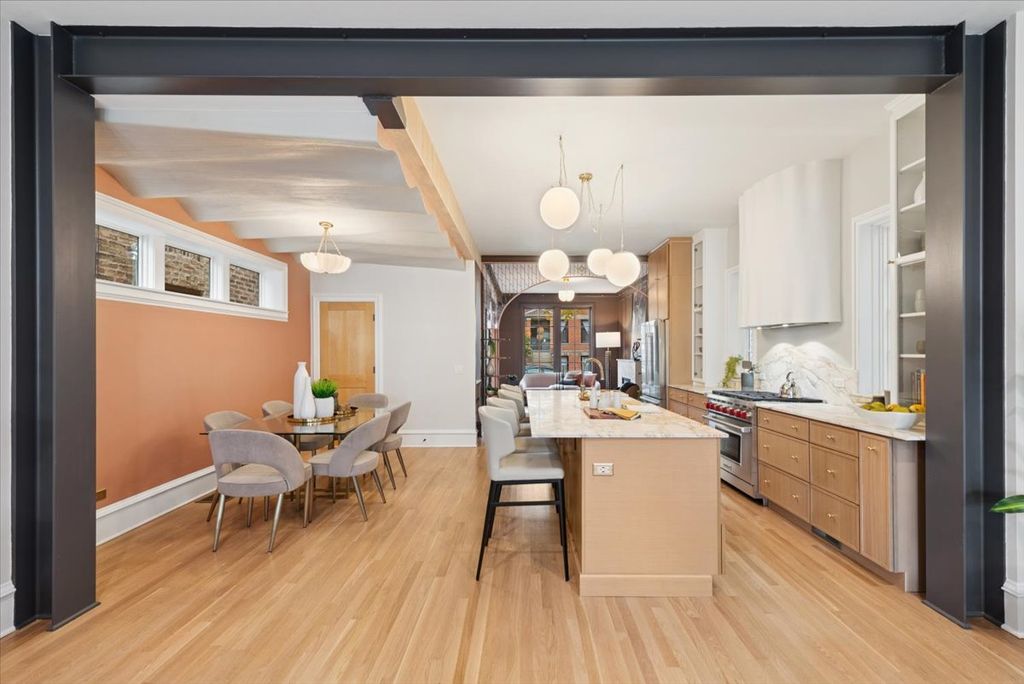 Truly extraordinary Bucktown home built with quality and character throughout! Loaded with custom details and innovative design elements, this artfully crafted property is one of a kind and unmistakably special. Equally impressive as the home's craftsmanship is its livability, with generous room sizes throughout, including a spacious family room addition that provides a primary living area with openness and width seldom seen in similar homes. The entry level is warm and welcoming, with its decorative foyer lit by oversized transom windows that lead to a formal front living room with herringbone floors, custom millwork, stonework, lighting, and tile. A beautiful marble fireplace anchors the space, while two handmade steel-and-glass elliptical archways with integrated walnut shelving and polished brass accents serve as striking architectural centerpieces. The gorgeous kitchen features slim-shaker cabinetry with glass and wood fronts, honed marble countertops, a nine-foot island with overhang seating, and professional-grade Wolf and Bosch appliances. The adjoining dining area comfortably accommodates a full-sized dining table and is accented by a handcrafted plaster ceiling with a textured, undulating surface mirrored in the hood design above the stove. A grand skylight floods the second level with natural light, which includes three sizable bedrooms and two full baths. Each bathroom showcases custom tilework, along with reclaimed materials used in the construction of the primary bath vanity and the restoration of the property's original cast iron clawfoot tub. The lower level was dug down to provide eight-foot ceilings and features an additional living room, full bath, and a fourth bedroom or flex space complete with a wet bar and beverage fridge. Luxury vinyl plank flooring runs throughout the lower level, complemented by more custom millwork, including an additional dry bar with a quartzite counter and an artful decorative stairway feature. Great outdoor spaces, including a large deck off the first-floor family room and a garage rooftop deck, both constructed with Trex materials. The garage rooftop deck features a steel staircase, inset perimeter lighting, and electrical service. Too many details to list!! Brick and cementboard construction, all new plumbing, electrical (including EV service in the garage), roof, dual-zoned HVAC, closed-cell foam insulation, premium Marvin windows and white oak flooring throughout. Unbeatable Bucktown location on a mature tree-lined street with quick access to top parks, retail, grocery, and entertainment. Ideally positioned for convenient access to public transportation and nearby expressways. Welcome home!