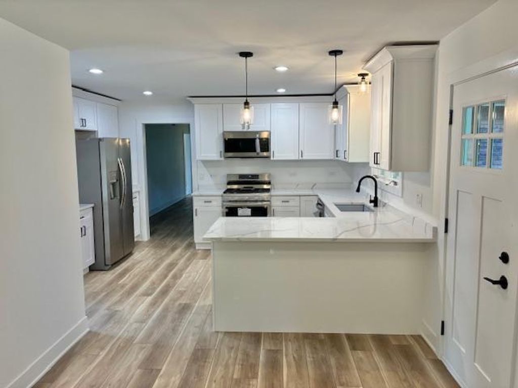 Great remodeled 4 bedroom ranch. Enjoy peace and quiet in this beautifully decorated home which includes the following which are brand new: Kitchen cabinets/vanities, Doors/base/trim, quartz tops, light fixtures, LVL flooring throughout, tile in all bathrooms, master shower and glass, toilets, faucets and much more. Featuring 4 large bedrooms, 2/1 baths, sunken living room, formal dining room, family room with fireplace. Massive full basement. 3 car attached garage, brick patio with a huge secluded back yard. This is a must see. House is being sold as is.